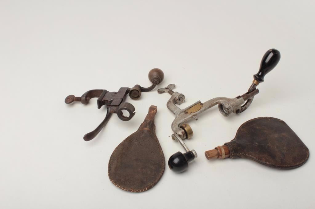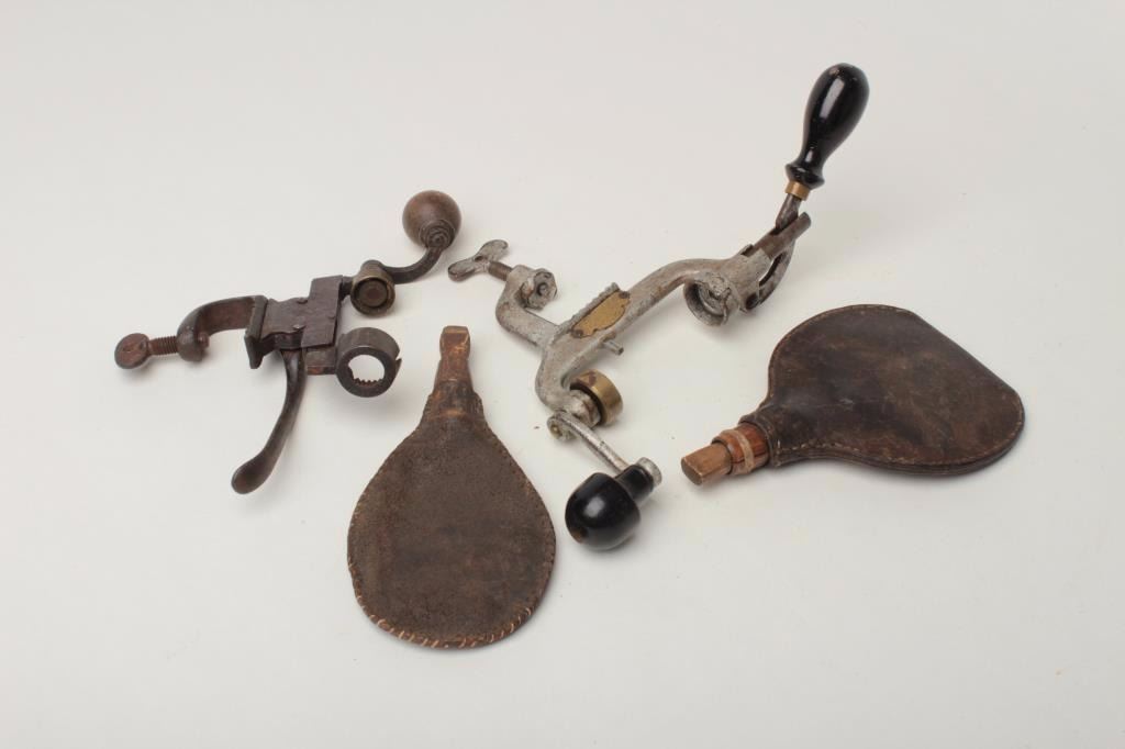 Lot 1072 Lot includes 2 shotgun reloading tools, 1, French and 1,German crimpers and 2, Leather shot bags.