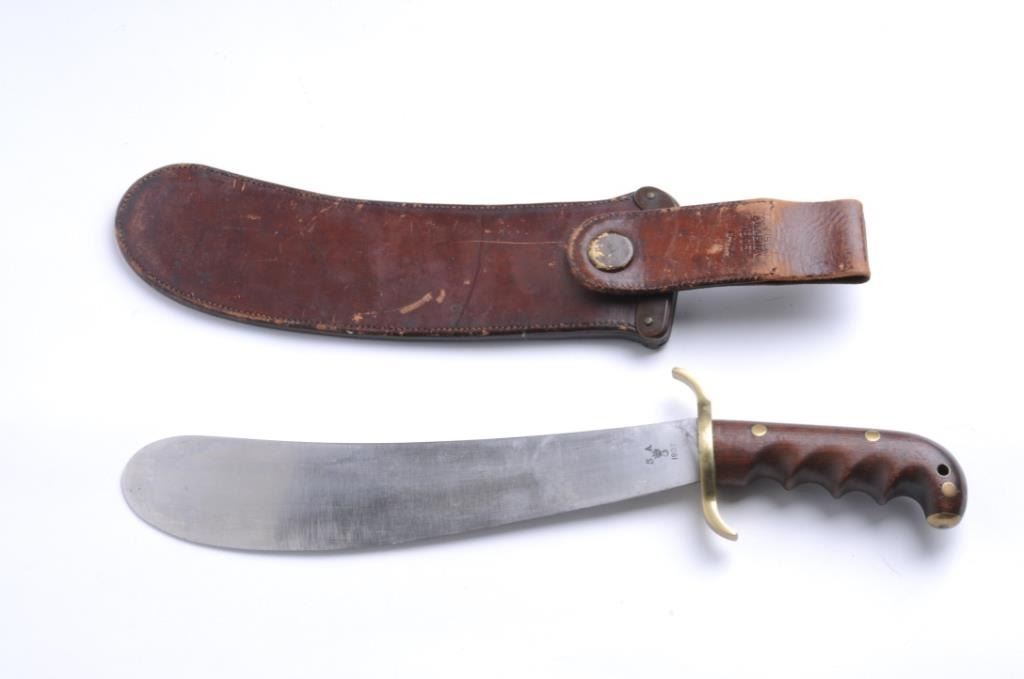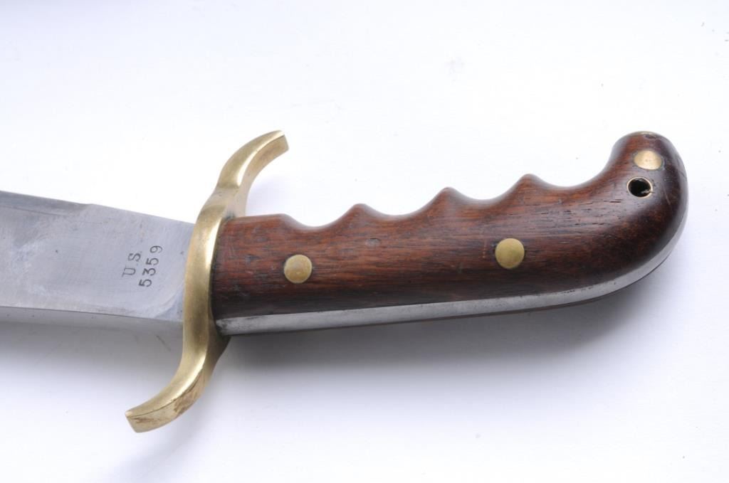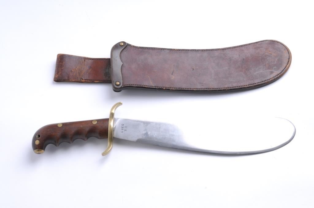 1904 hospital corps bolo knife with scabbard. The blade is near fine and dated 1907 with SN: 5359. The scabbard is marked Rock Island Arsenal 1905. W.C. inspection. Also almost fine. Est.: $300-$600