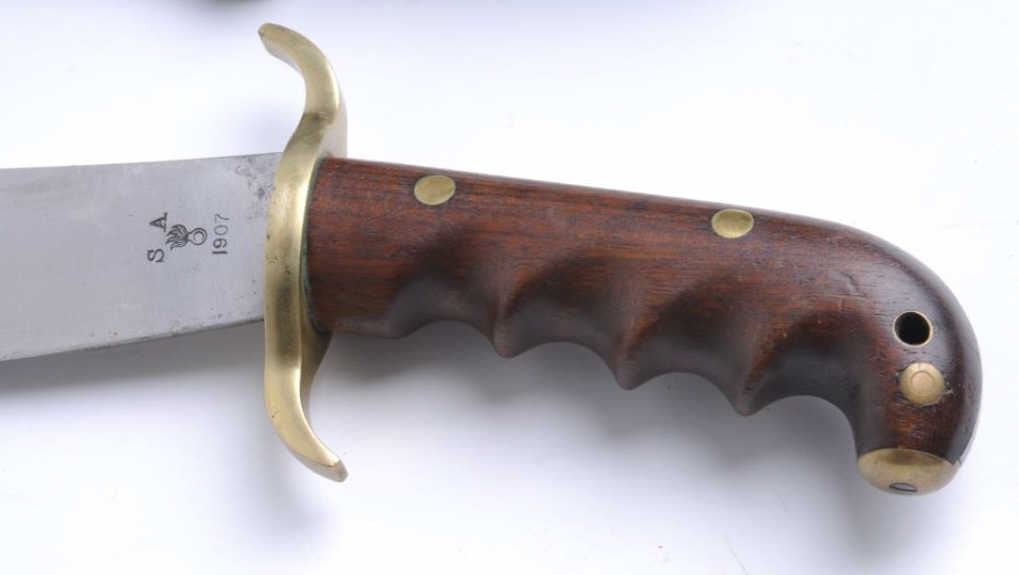 Lot 1149 1904 hospital corps bolo knife with scabbard. The blade is near fine and dated 1907 with SN: 5359.