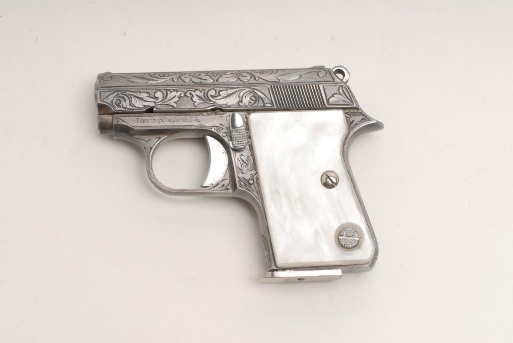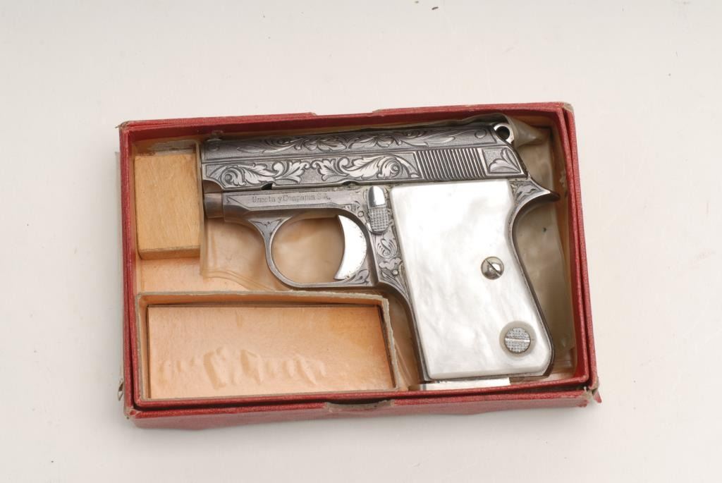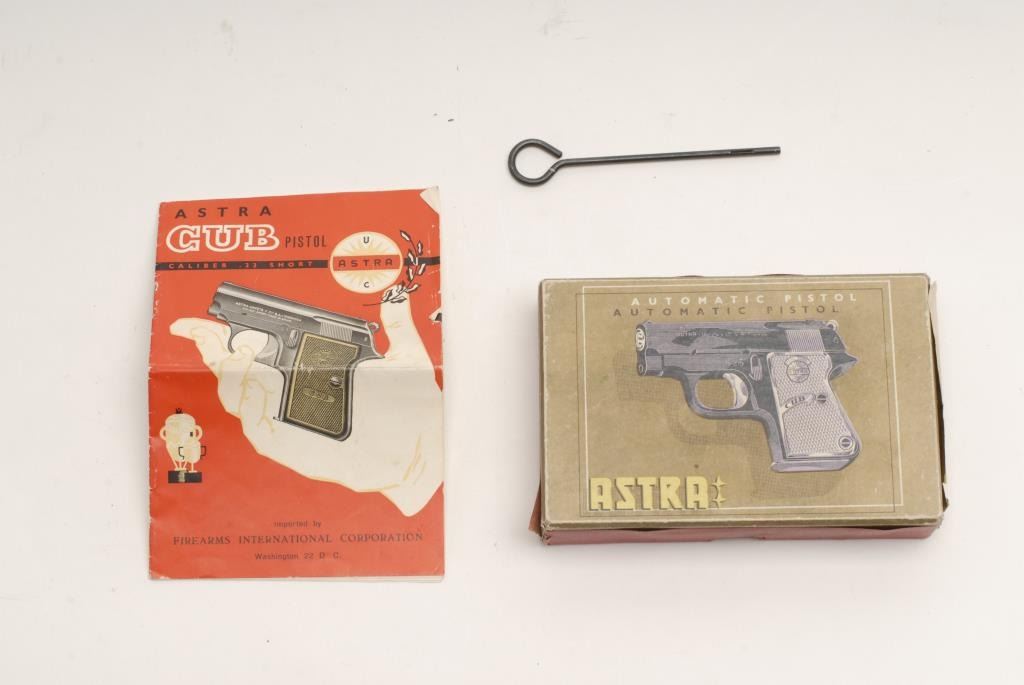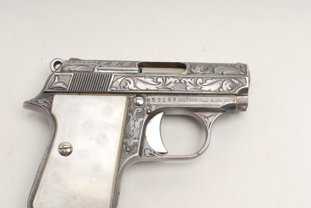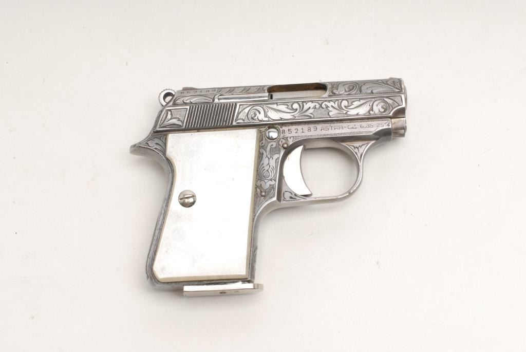 Astra Cub Model semi-automatic pistol, .25 cal., serial #852189. The pistol is in very good condition in its original box with all literature. The pistol sports a 2 ¼” barrel. The pistol retains the majority of its nickel finish showingonly wear associated with storage. The gun is factory engraved in a leaf and scroll pattern. The faux pearl plastic grips are in very good shape with only light handling marks. One panel continues to resemble pearl while the other haslost its luster. The bore is very good, the action crisp and markings are sharp. The lot includes one correct, Astra marked magazine. Est.: $275-$475. (Modern).