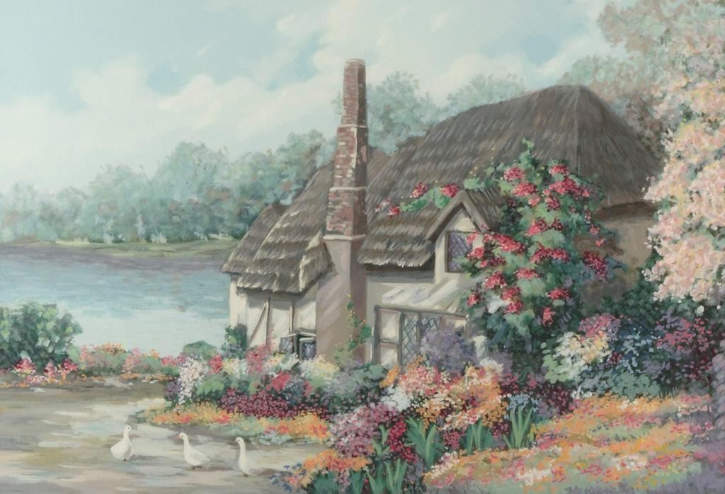 Framed and custom triple matted limited edition (206/300) hand signed color print of and English cottage and lake by listed contemporary artist Erlene Moses, approximately 31” x 36” overall. Est.: $175-$350.