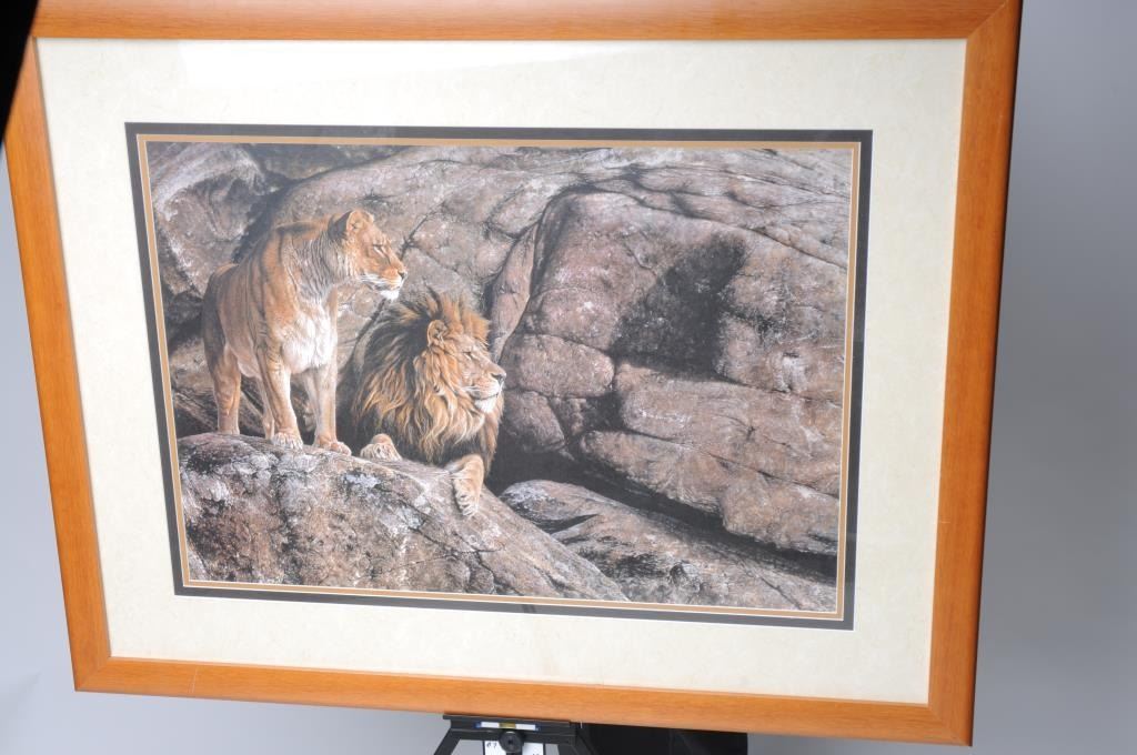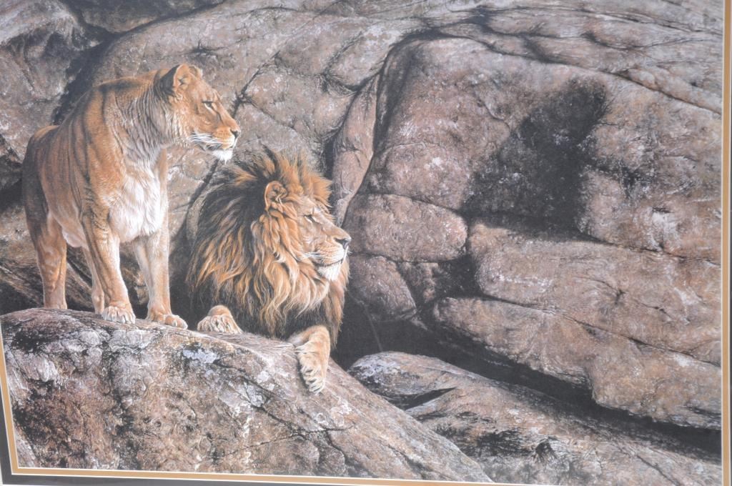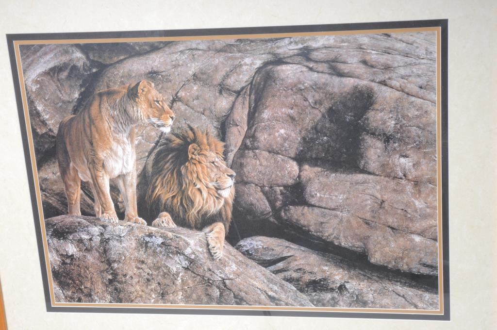 Lot 1225b Framed and triple matted color print of Lions in rocks by Alan M. Hunt (1989), approximately 33” X