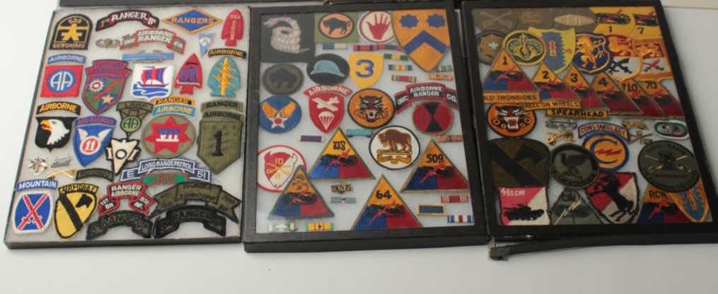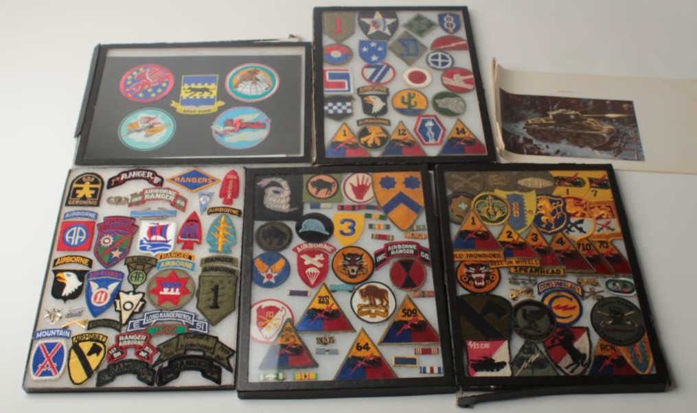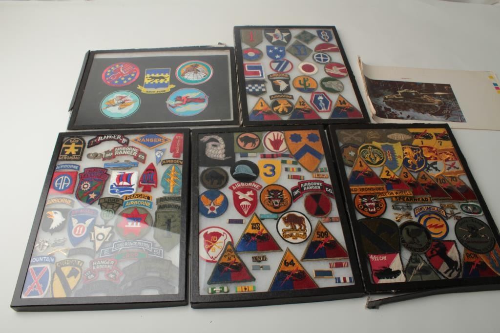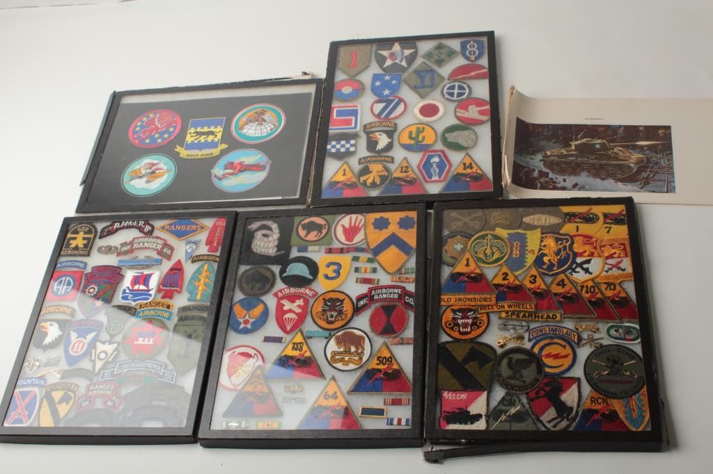 Lot of 5 riker cases of military patches and pins; many hard-to-find. Est.: $150-$300.