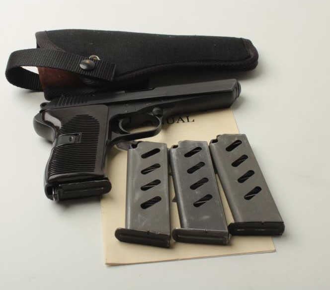CZ Model 52 semi-automatic pistol, import-marked, 7.62mm caliber, 4.5” barrel, S/N CB 03415, mat black finish, maroon grips, in overall very good condition with very good bore, markings, crisp action and very good grips; accompanied byinstruction manual, 3 extra magazines and cardboard shipping box; also a Gould and Goodrich woven holster. (Modern/PPT). Est.: $200-$400.