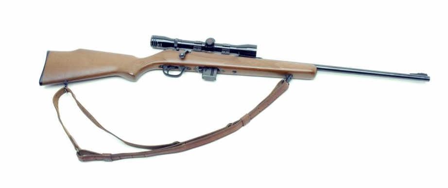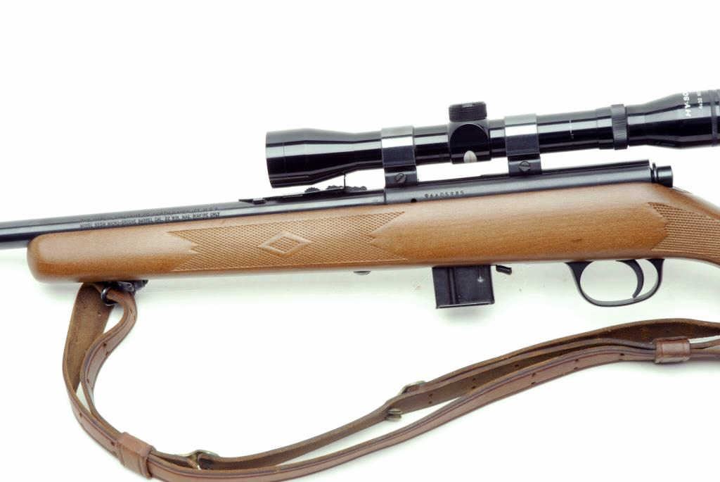 Marlin Model 925M bolt action magazine fed rifle, .22 Win. Mag. RF caliber, 22” round barrel, S/N 96605985, blued finish, checkered wood stock with leather sling and mounted with a Hy-Score 4X32 scope displaying crisp optics. This rifle is inoverall fine condition showing little use or handling. (Modern/PPT). Est.: $200-$400.