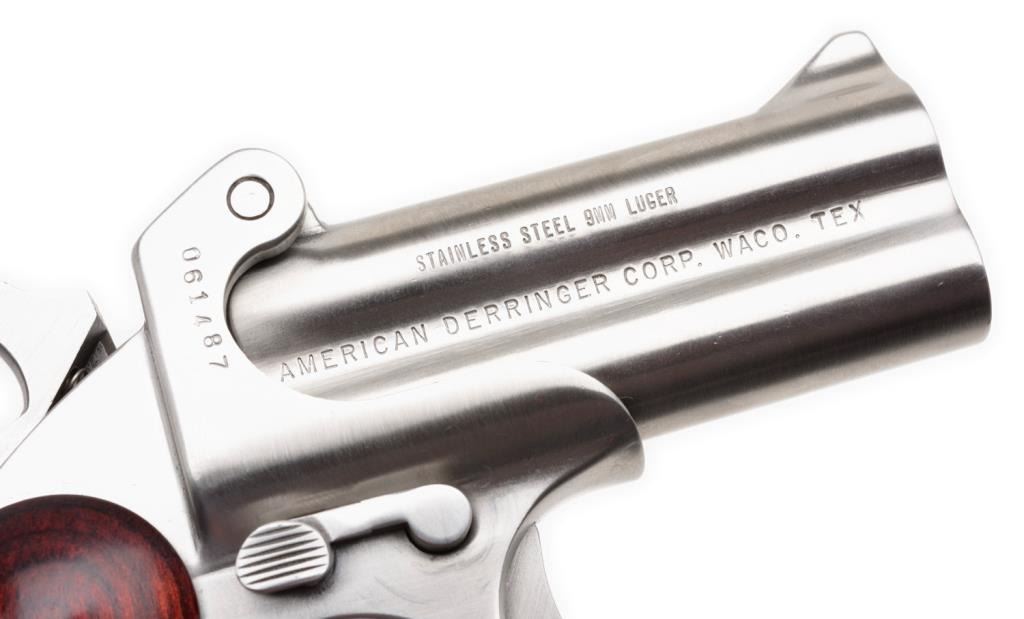 Lot 1319 **American Derringer Stainless Steel pistol, 9mm Luger caliber with 3” barrels, S/N 061487. The p