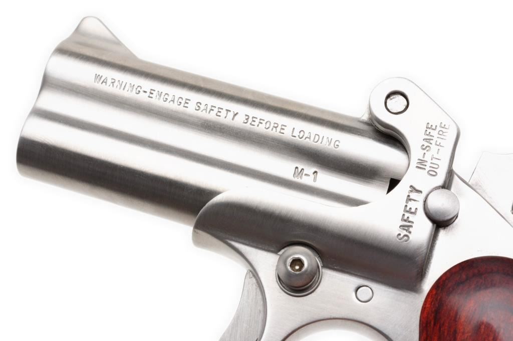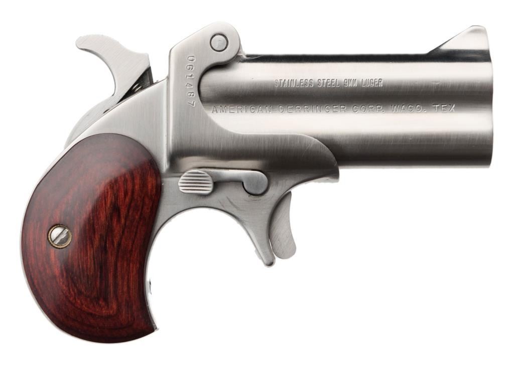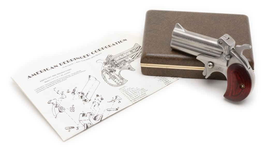 **American Derringer Stainless Steel pistol, 9mm Luger caliber with 3” barrels, S/N 061487. The pistol is in overall excellent condition in the original box. The pistol shows little to no use with a brushed stainless finish. The smooth woodgrips are also in excellent condition with only slight handling marks. Est.: $100-$200.