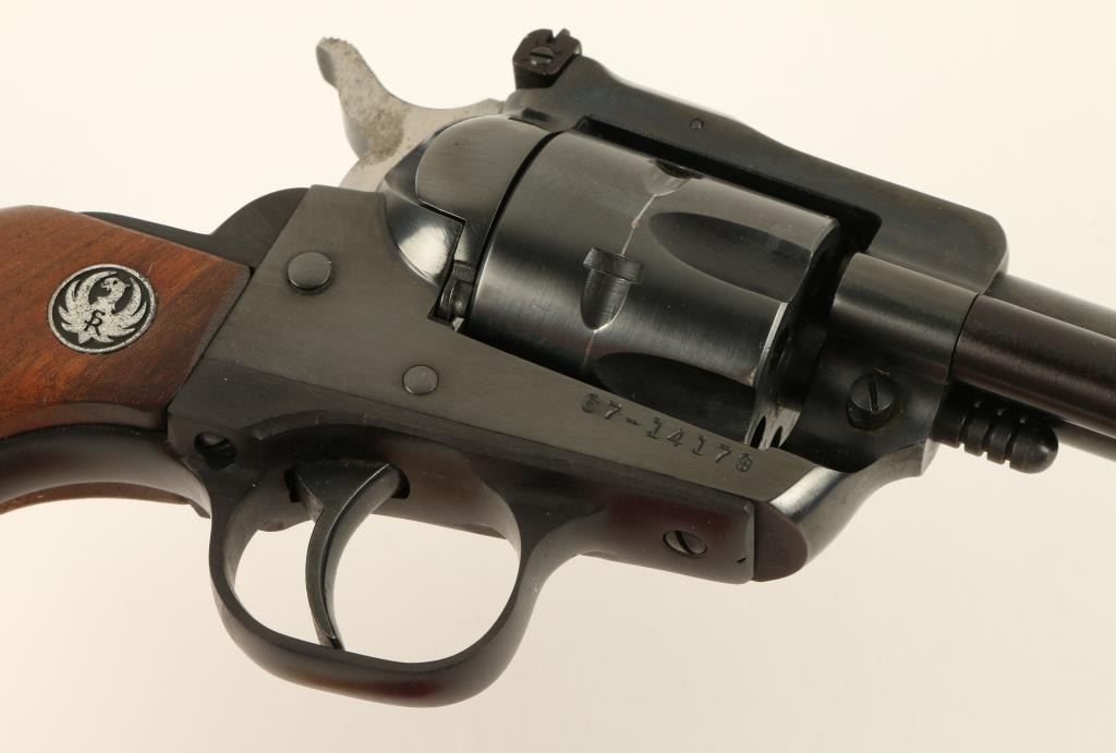Ruger New Model Single-Six revolver, .22 caliber with an extra .22 Magnum cylinder, 6.5” barrel, S/N 67-14179, blued finish, wood medallion grips in overall very good to fine condition with the majority of its original finish remaining, crispaction, markings, bore and grips. (Modern/PPT). Est.: $250-$500.