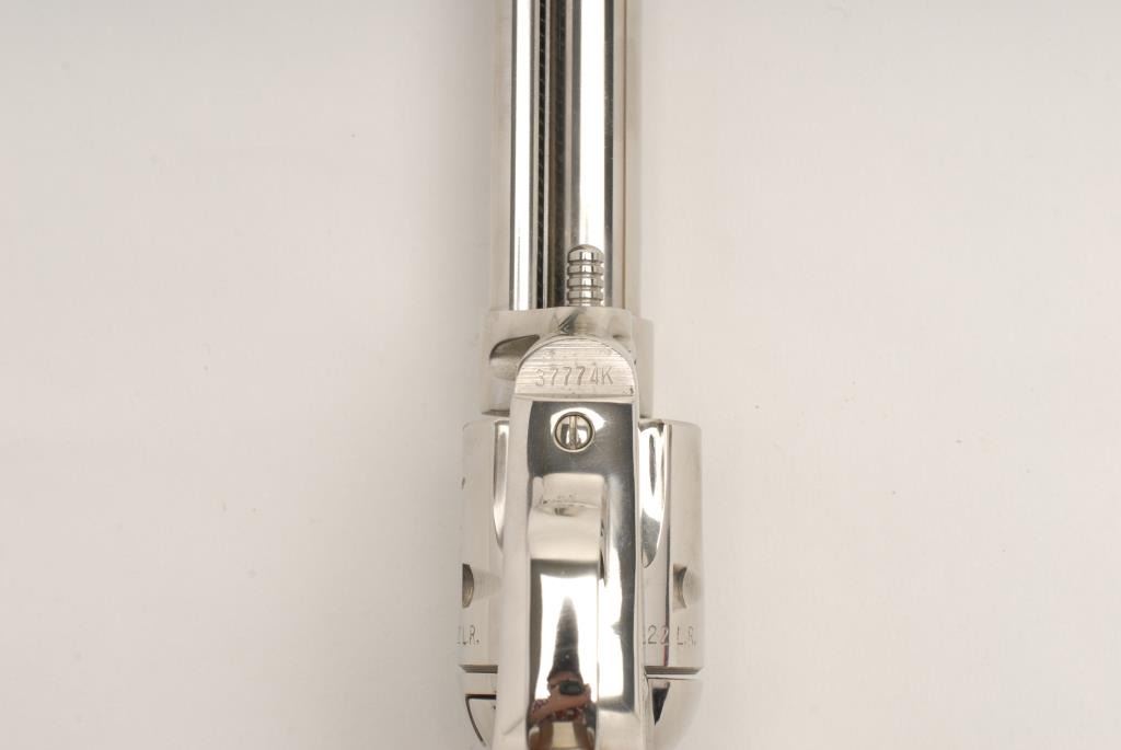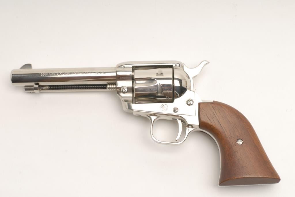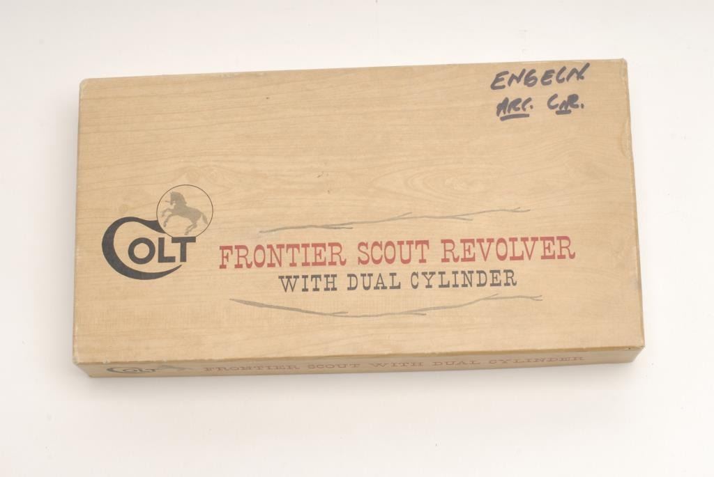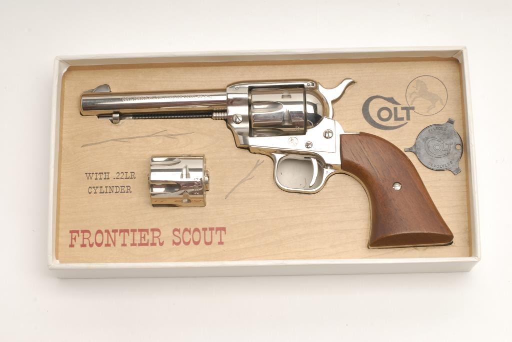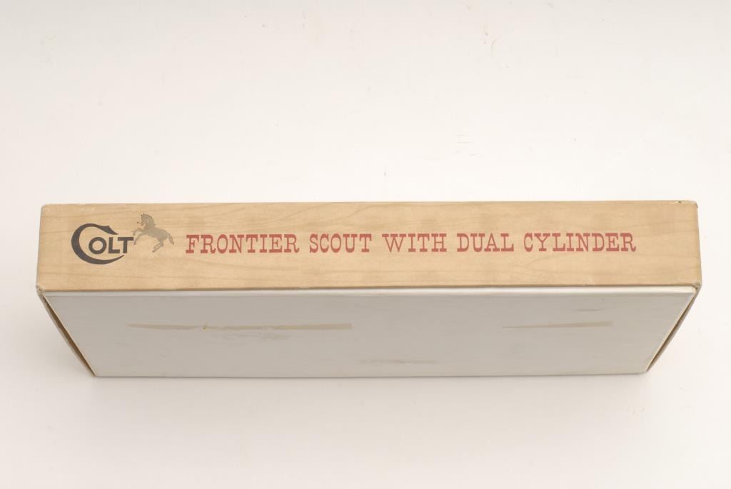 Colt Frontier Scout Single Action Revolver, .22 L.R. caliber, 4 ¾” barrel, nickel finish, wood grips, S/N 37774K. This revolver remains in like new condition showing very little handling and no use in original box. The box shows some tattersfrom storage. Also included is a .22 mag cylinder along with original manual, papers, and Colt screwdriver. (Exempt) Est.: $450-$900