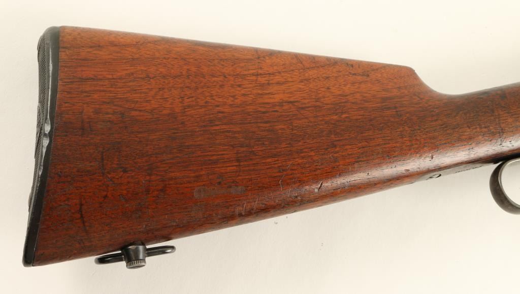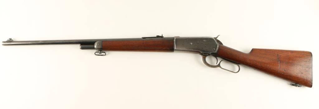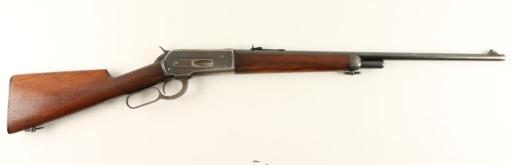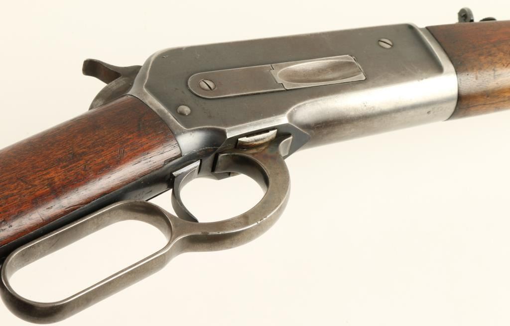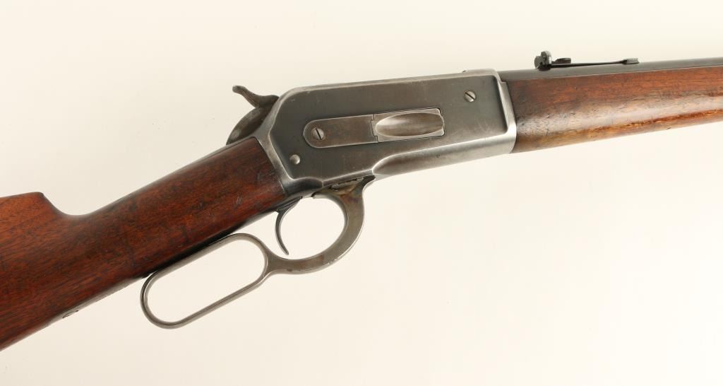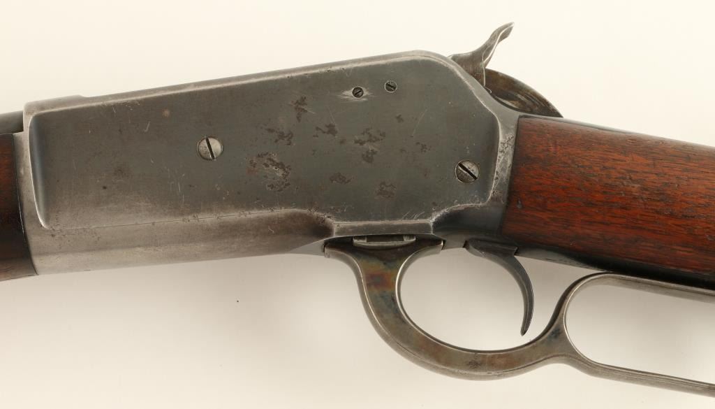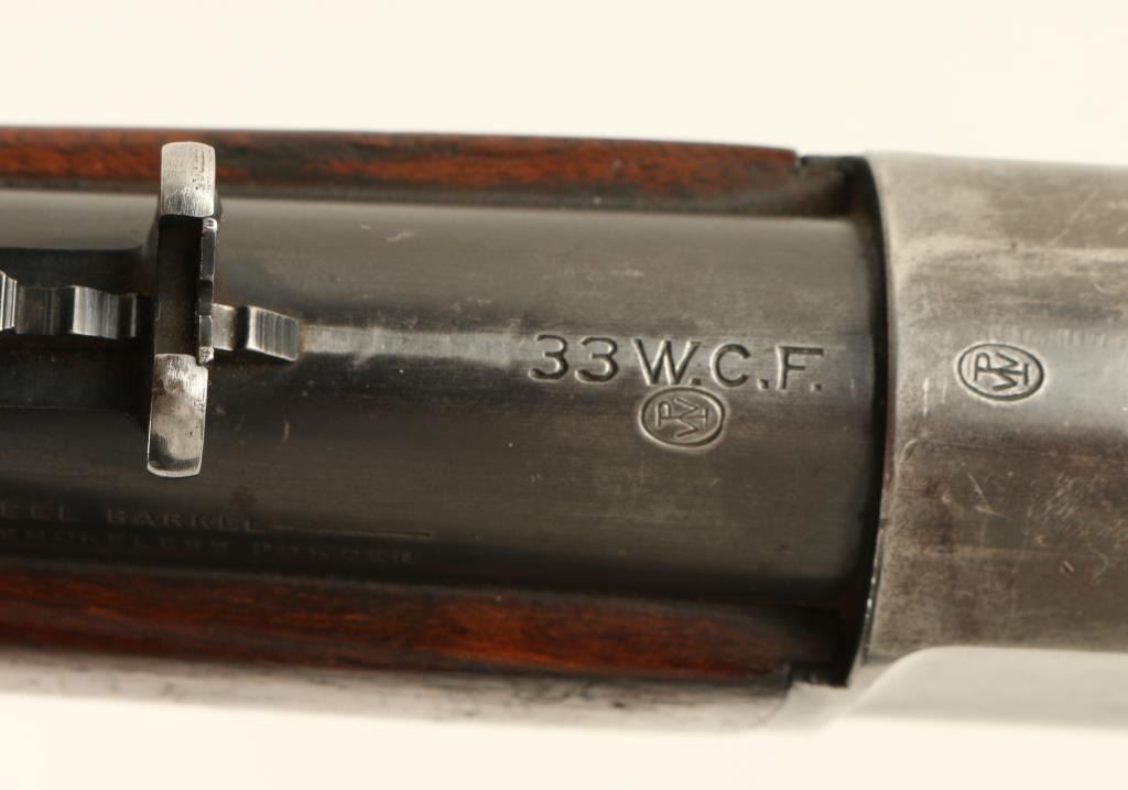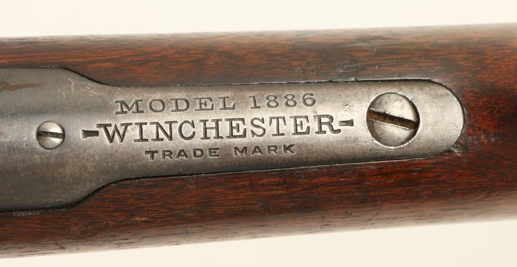 Winchester Model 1886 solid frame, light weight lever action rifle, half magazine, added sling swivels, .33 W.C.F. caliber, 24” round barrel, S/N 143198, blued finish, wood stocks in overall very good condition showing the majority of itsoriginal blue finish on metal surfaces and bright case colors on the front of the lever; crisp action, sharp markings, near fine bore with good to very good stocks displaying some scattered old mars from carry and storage and handling wear tothe finish of the underside of the forend. (C&R). Est.: $1,200-$2,400.