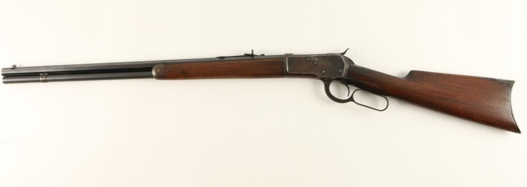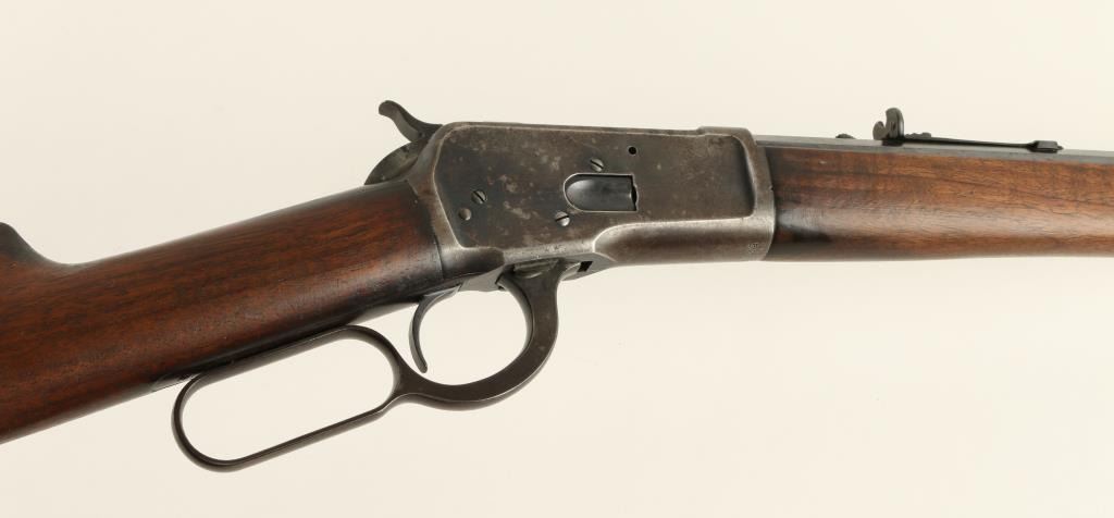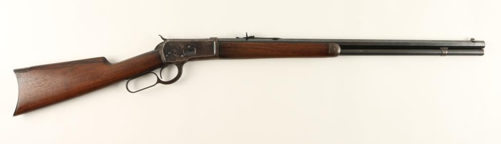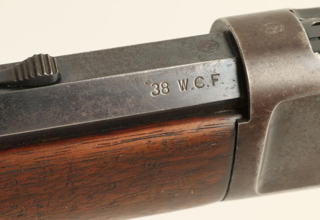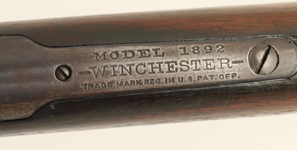 Winchester Model 1892 lever action rifle, .38 W.C.F. caliber, 24” octagon barrel, S/N 529792, blued finish, wood stocks in overall very good to near fine condition showing the majority of its original blue finish, very good bore, crispaction, sharp markings and good to very good wood with an old sliver loss at the left front of the forend, minor scattered old storage mars and some old oil staining of the butt stock around the upper tang. (C&R). Est.: $1,200-$2,400.