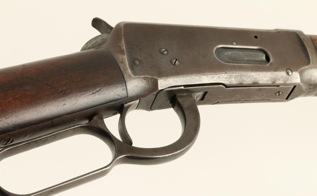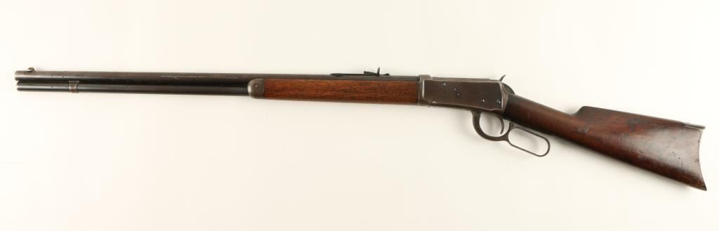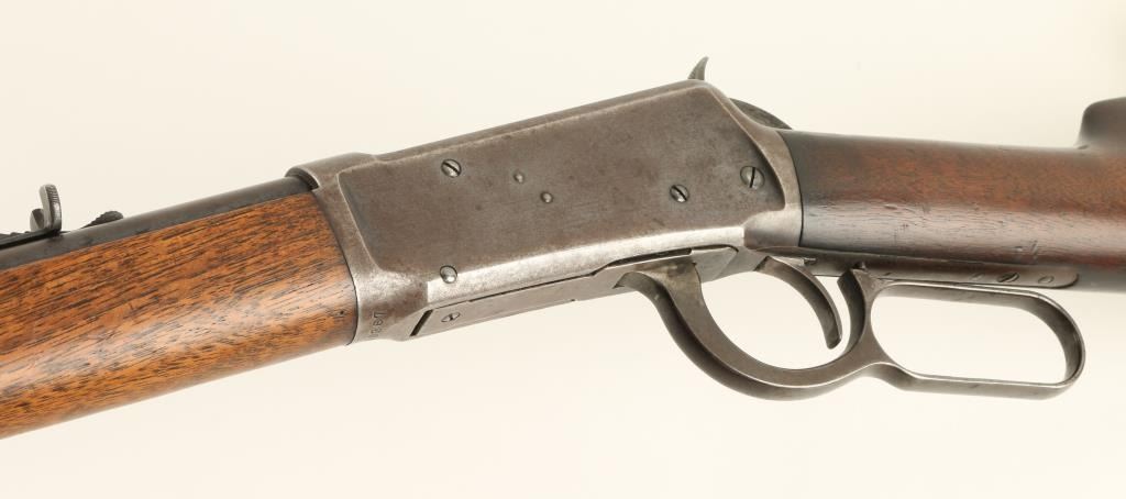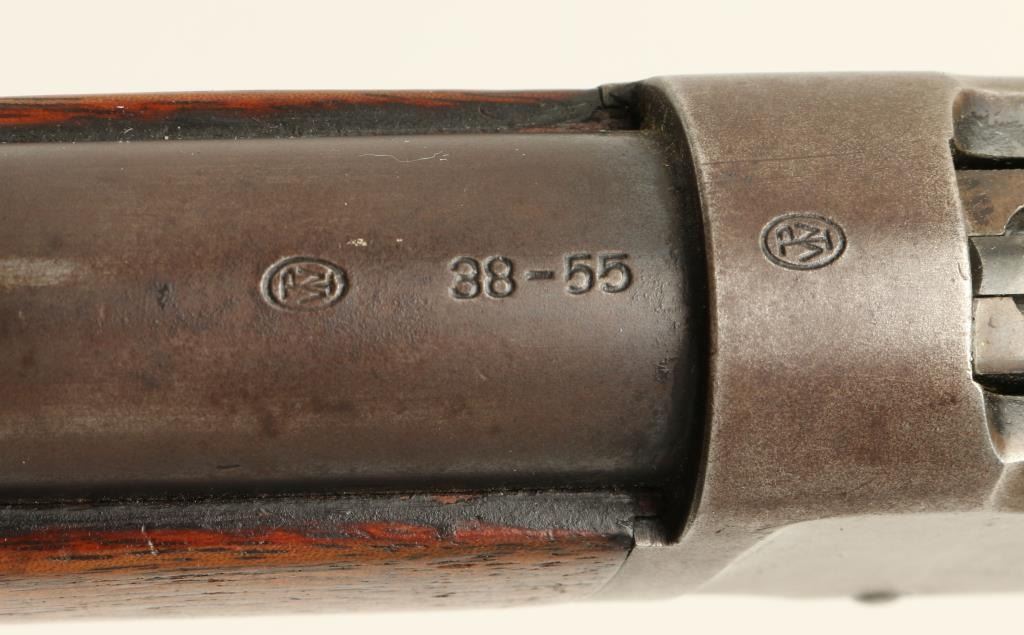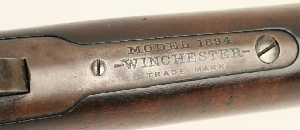 Winchester Model 1894 lever action rifle, .38-55 caliber, 26” round barrel, S/N 349367, blued finish, wood stocks in overall very good condition displaying a plum brown patina mixed with considerable original blue on metal surfaces, very good bore, crisp action, and markings, good wood stocks with butt stock showing scattered old mars and scratches from carry and storage. (C&R). Est.: $1,250-$2,500.