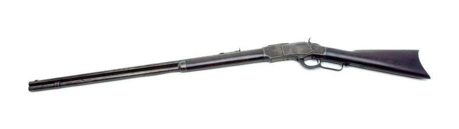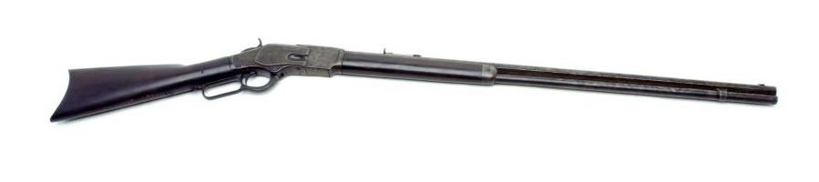 Winchester Model 1873 lever action rifle, .38 W.C.F. caliber, extra long 30” octagon barrel, S/N 447263B, in overall good condition showing a dark patina to metal surfaces with scattered areas of erosion, pinprick pitting and some knackering;crisp action, good markings and fair bore with some areas of pitting; overall good wood with an old crack at the left side of the butt stock at the tang only. (Antique). Est.: $1,500-$3,000.