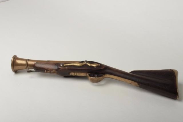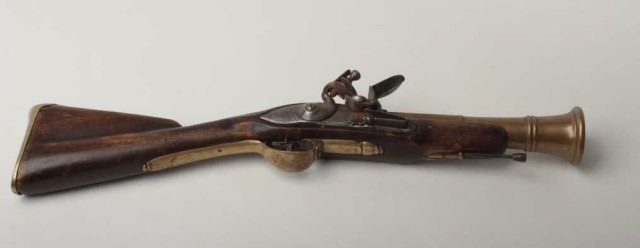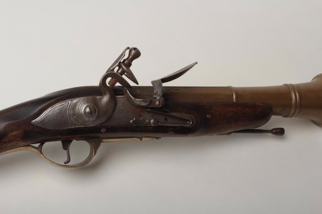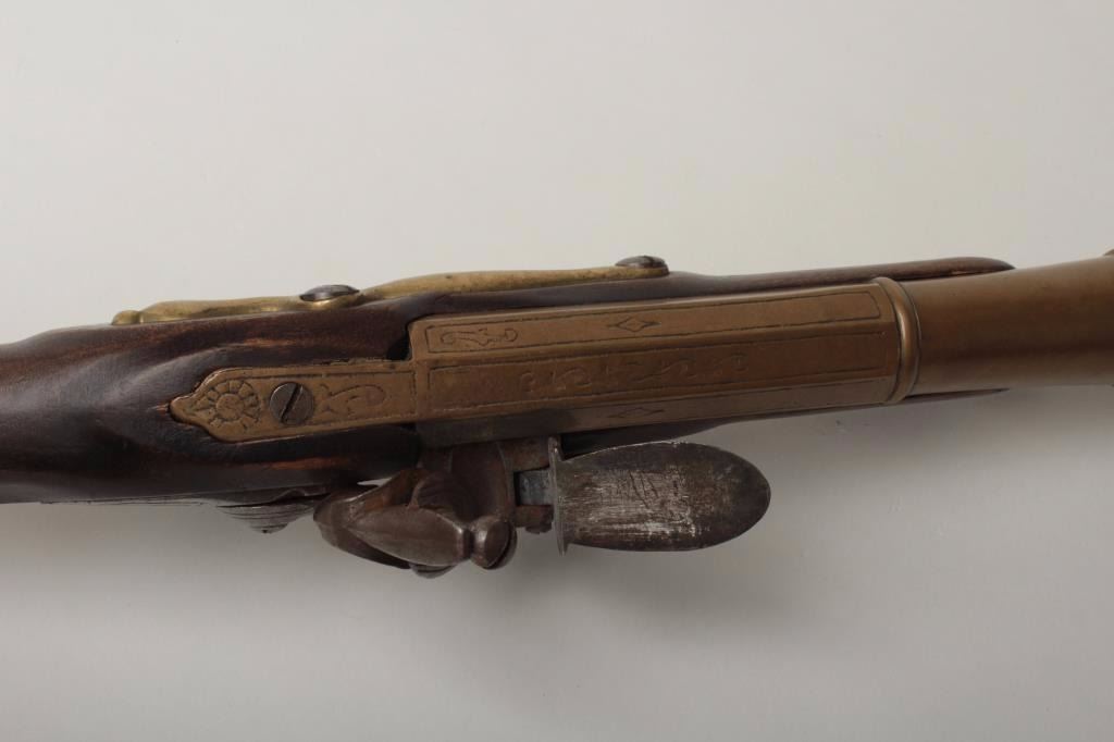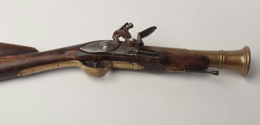 Lot 1408 Brass Barrel Flintlock Blunderbuss, 2.25" bore diameter at flared muzzle, 10.5" round to octagonal