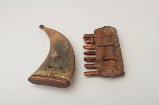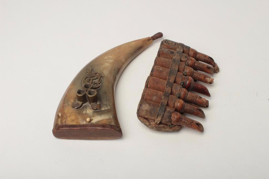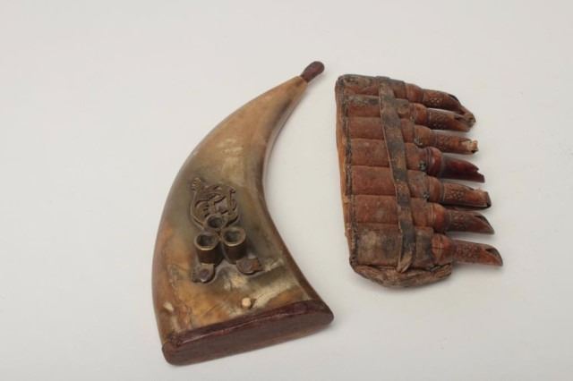 Mid-Eastern Powder Horn and Loaders, 11" flat sided horn with miquelet tool mounted at lower center, 7 powder loaders in leather holder with belt loops.Est:$200-300