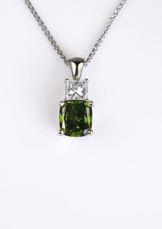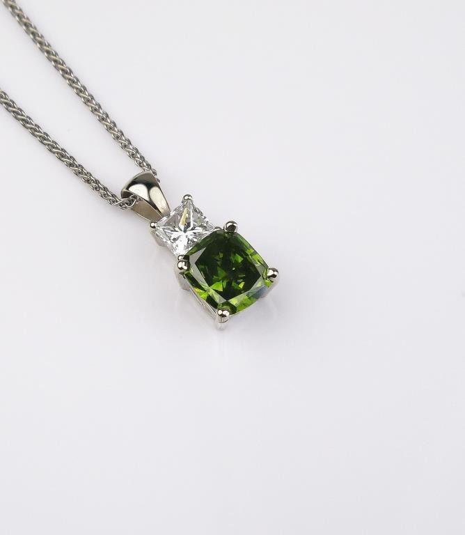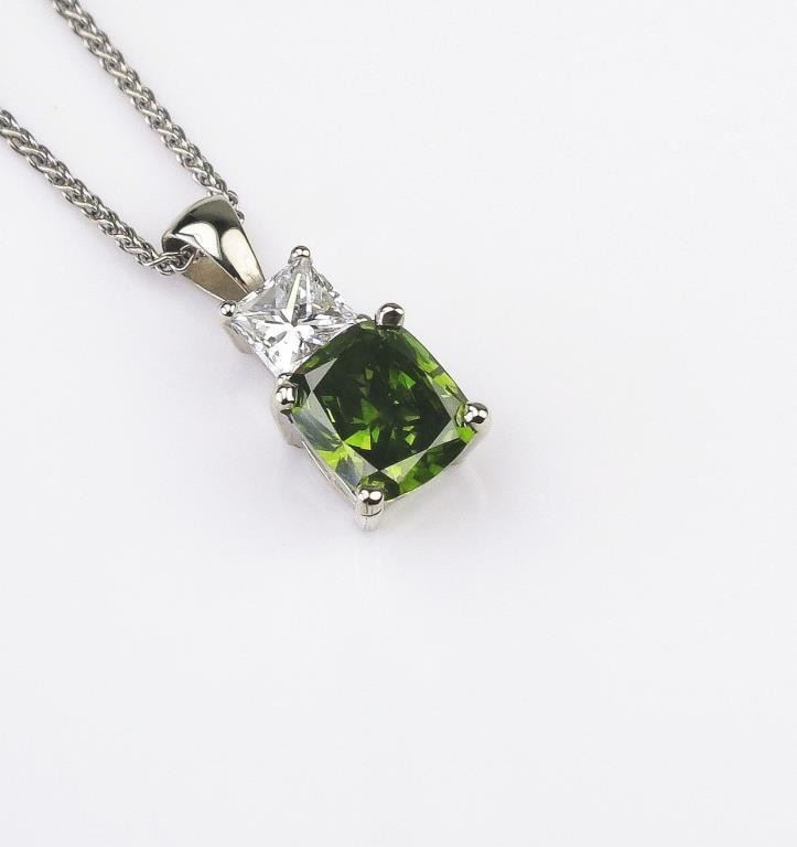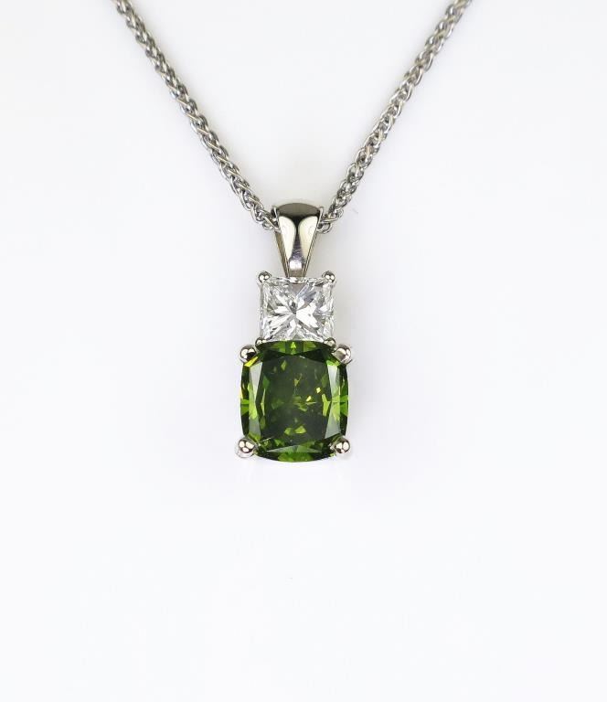 Lot 1438a Brilliant Green and white diamond pendant featuring a 1.34 carat cushion cut color enhanced Fancy