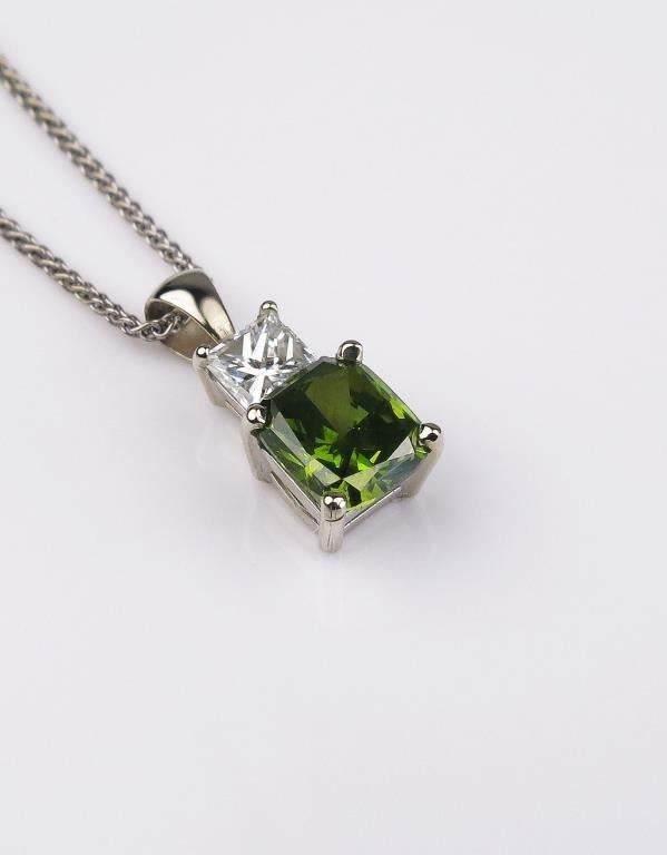Brilliant Green and white diamond pendant featuring a 1.34 carat cushion cut color enhanced Fancy Green diamond of VS clarity accented with a 0.42 carat princess cut diamond of F-G color and VS clarity all set in a 14 karat white gold custom made setting. Retail $5,000-$7,000 Estimates $3,000- $4,000 Nice.