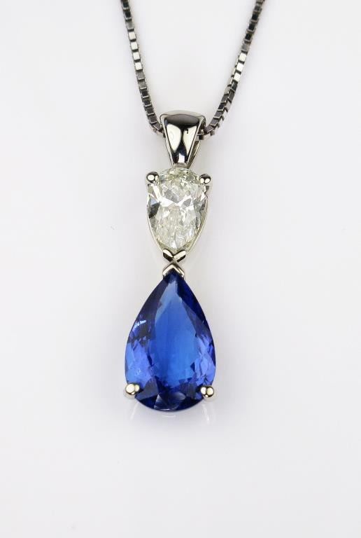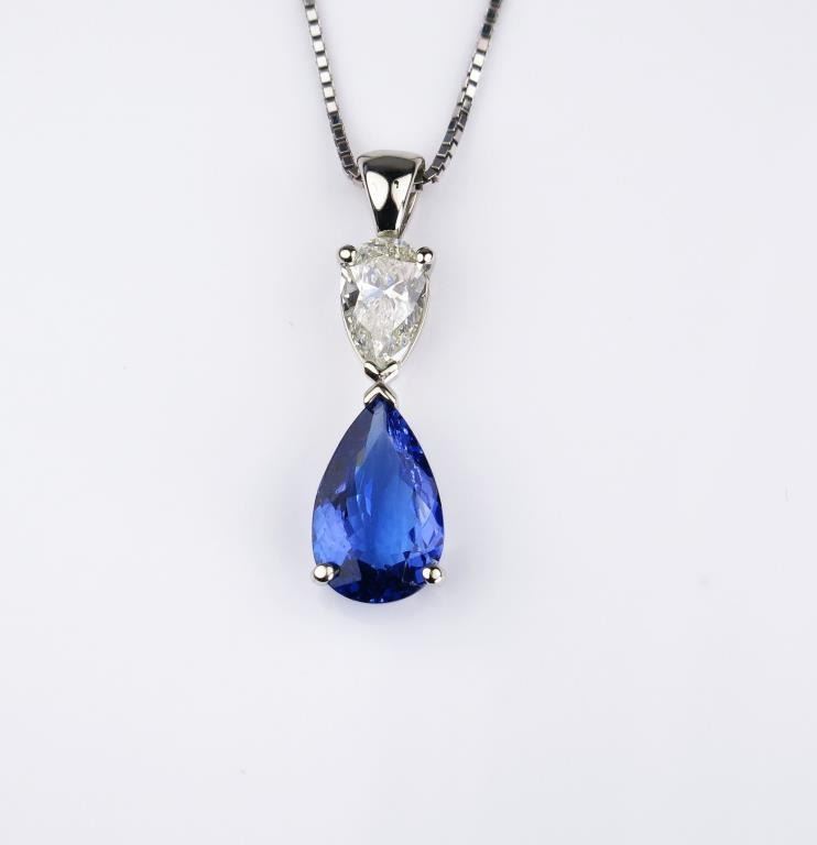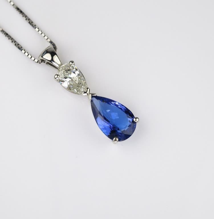 Amazing ladies pendant set with a fine Pear shape Tanzanite weighing 3.35 carats (looks like 4.00 carats) with a matching Pear shape diamond weighing approx. 1.00 carat of H-I color and VS/SI1 clarity set in a 14 karat white gold custom made setting. Retail $10,000-$12,000 Estimates $5,000-$8,000 A fine item.
