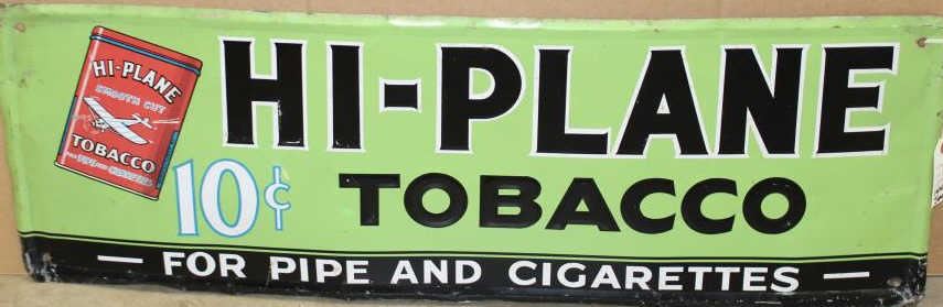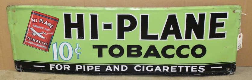 Hi-Plane 10 Cent Tobacco tin sign, approximately 12” x 35” in overall good condition with majority of original paint; some edge denting. Est.: $100-$200.