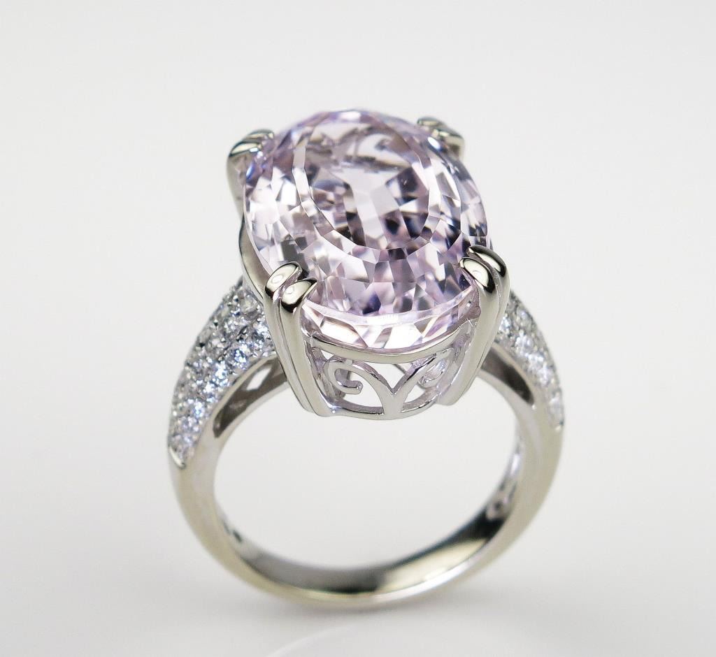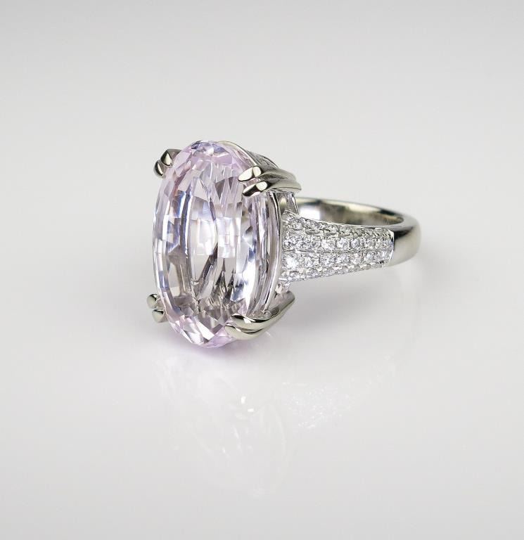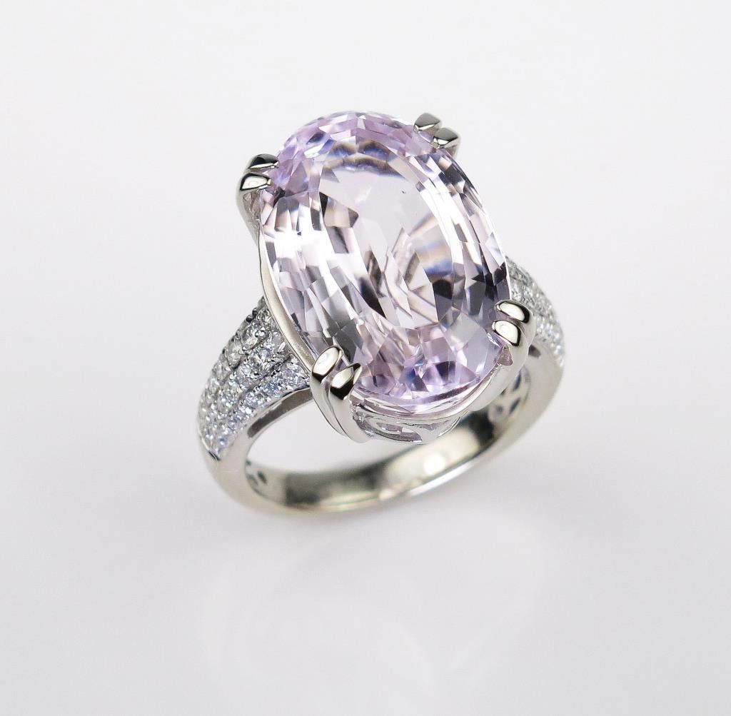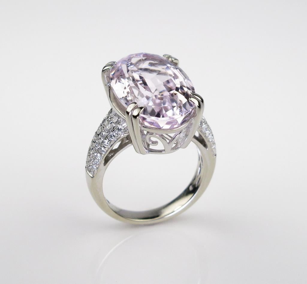 Fabulous ladies ring set with a fine pink KUNZITE weighing over 17.00 carats and micro set with 60 ‘IDEAL’ cut diamonds weighing approx. 0.80 carats of F-G colors and VS/SI clarity set in a 14 karat white gold custom made setting. Retail$6,000-$8,000 Estimates $3,000-$4,000 A fine item.