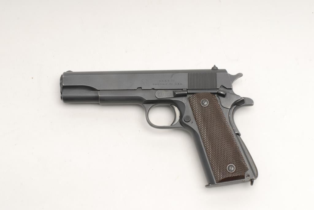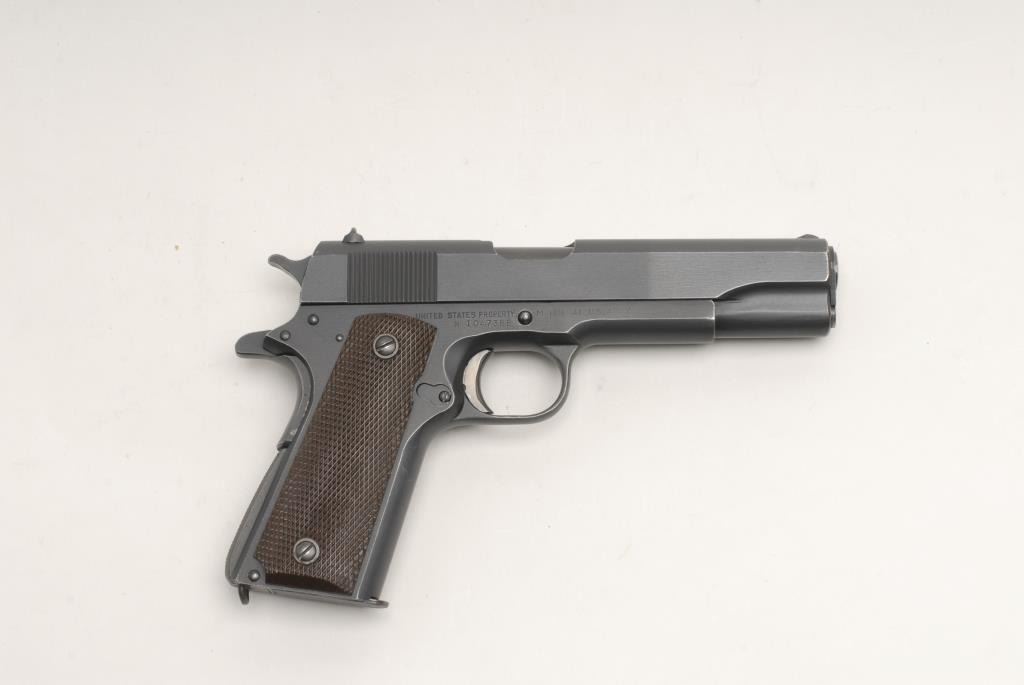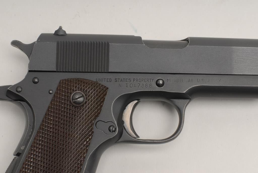 U.S. Property marked Model 1911 semi-automatic pistol by Union Switch & Signal, .45 caliber, 5” barrel, S/N 1047388, in overall fine to excellent original condition with approximately 98%-99% DU-LITE finish, crisp action, sharp markingsincluding an “RCD” inspector’s mark on the left side of the frame above the magazine release, fine bore, fine plastic Keyes Fibre grips, checkered mainspring housing. According to the Standard Catalog of Military Firearms by Schwing, only55,000 pistols total were delivered in 1943 to the military from Union Switch & Signal Co., making it one of the most sought after of all the 1911/1911-A1 pistols; in this cataloger’s opinion, this one qualifies as a “9” on a scale of 1-10and worthy of inclusion in any fine collection. (C&R). Est.: $8,000-$10,000.