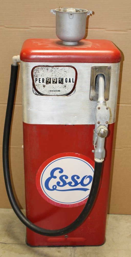 Old Esso metal gasoline pump, approximately 40” in height, 16” wide and 10” deep; missing the top globe. Est.: $500-$900.