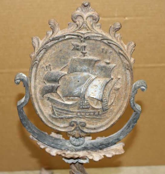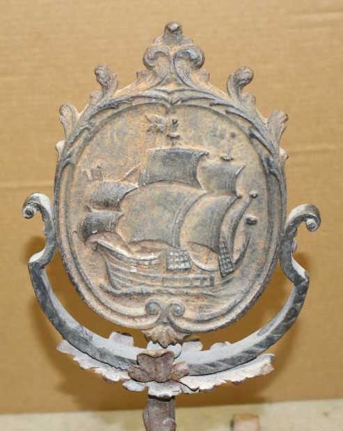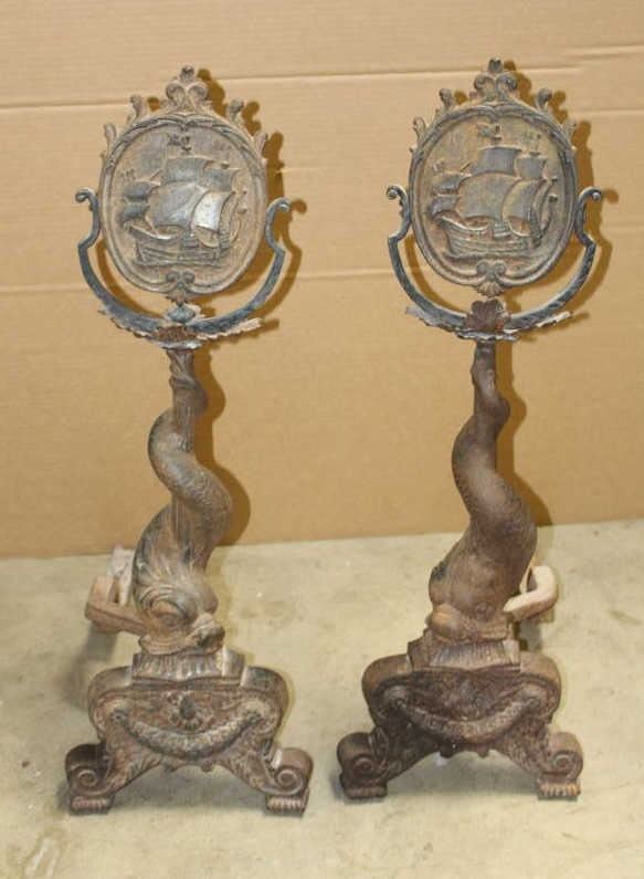 Pair of old iron fire place stands (andirons); in serpents and sailing ships motif; approximately 33” in height. Est.: $800-$1,200.