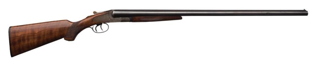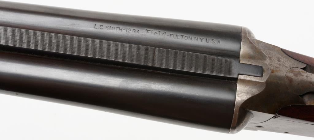 L. C. Smith Field Grade 12 gauge double barrel shotgun, 30" barrels, double triggers, standard extractors, pistol grip stock, in very good original condition, serial #S5277, with armor steel marking on bottom of barrels and Fulton NewYork address with no Hunter Arms. The barrels retain 95%+ original blue finish, some erosion, and a bad dent in right barrel 6-3/4" back from the muzzle. The frame shows 10-20% case hardening drifting to patina; the stocks are very good+with some better than average grain for a slightly select grade. The right barrel is choked modified, left barrel is improved modified. The action is tight, bore is good other than mentioned dent, which is fixable. Est.: $900-$1,800