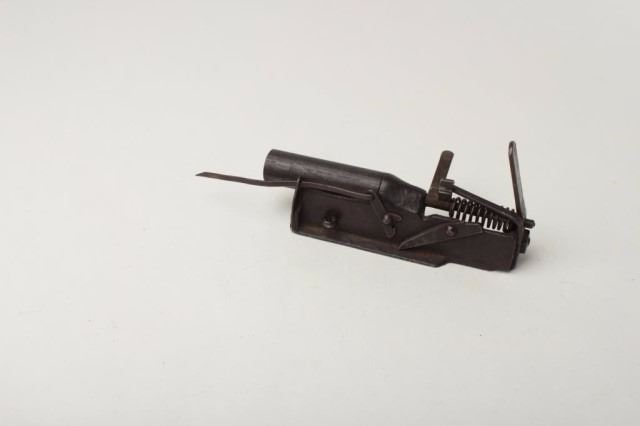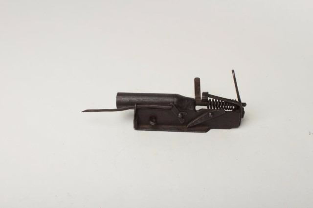Shotgun Trap Gun, 12 ga., 3.5" barrel, slam fire spring loaded trap with no marks at all to be found. may be blacksmith made. Est:$200-400
