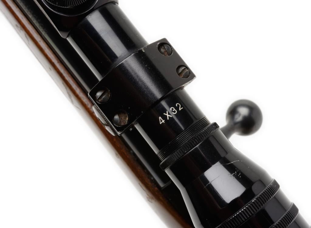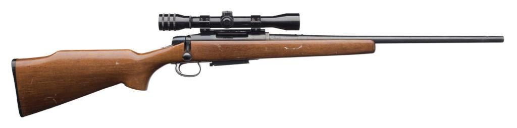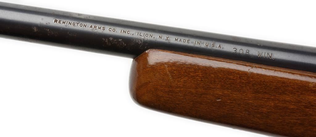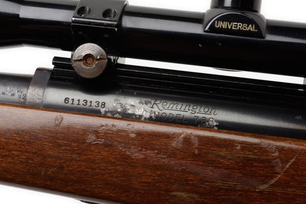 *Remington Model 788 bolt action rifle, .308 Win. caliber, 21.5” barrel, S/N 6113138, blued finish, wood stock and mounted with a Universal 4x32 scope with crisp optics; overall good to very good condition with a very good to fine bore, actionneeds work, one magazine, scattered spots of wear to finish and some areas of pinprick pitting; good stock; great caliber. Est.: $450-$650.