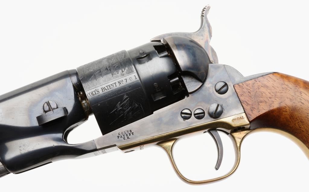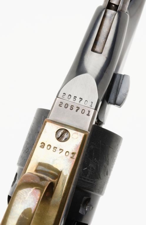 Colt New Series Blackpowder Model 1860 Army percussion revolver, .44 caliber, 8” barrel, S/N 205701, blued and case hardened finish, wood grips; overall fine condition showing little if any use. Est.: $400-$500.