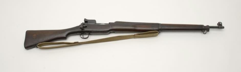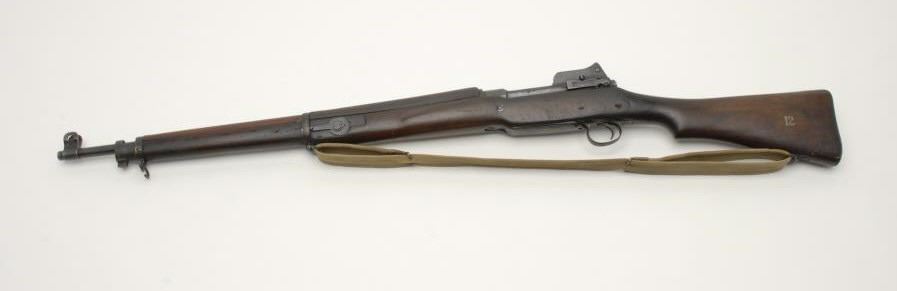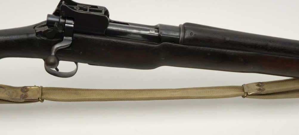 Eddystone MK 1 Pattern 14 bolt action rifle, .30 cal., serial #102682. The rifle is in good to nearly very good overall condition with a 26” barrel. The barrel retains the majority of its military finish with some light surface rustevident. The action shows significant original military finish with interesting British proofs including the broad arrow mark. The receiver is marked, “ERA” for Eddystone Remington Arms. Additionally, the rifle features period “VolleySights” on the left side of the action and fore end. The smooth wood military stock is in good condition showing heavy use and wear but no major marks. The stock has a cartouche on the right side of the butt, “KKD 6-57” next to the priorlocation of the brass disc. The number “12” has been painted on the left side. Additionally, the rifle has sling swivels and an OD green canvass sling marked “577”. The butt stock ends with a smooth metal butt plate with trap. The bore isgood, the action is crisp and the markings are sharp. Est.: $300-600 . (C+R).