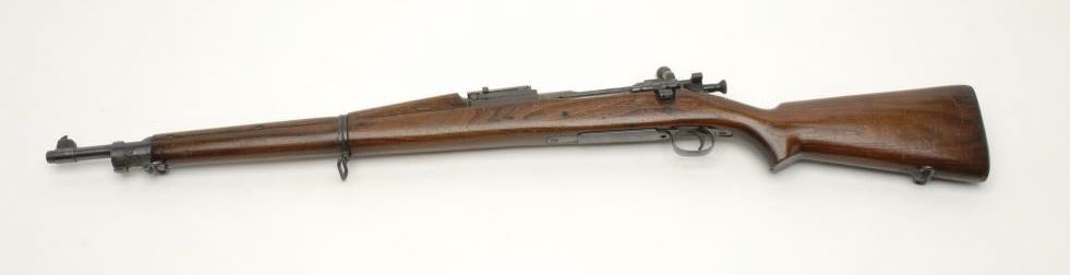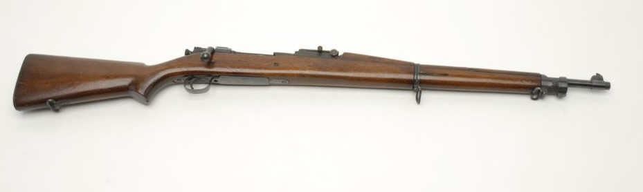 U.S. Remington Model 1903 bolt action rifle, .30 cal., serial #3230448. The rifle is in very good overall condition with a 24β barrel with a blade front and military style tangent rear sights. The barrel retains a significant amount of itsmilitary finish and is dated 9-42, marked with βRAβ and the Flaming Bomb emblem. The action shows considerable military finish with light surface erosion and surface rust. The smooth wood stocks are in good condition with typical marsand dents from use and an old coat of varnish added. The butt stock ends with a smooth, metal butt plate with trap. The rifle comes with sling swivels. The ore is good, the action is crisp and the markings are sharp. Est.: $300-$600.(C+R).