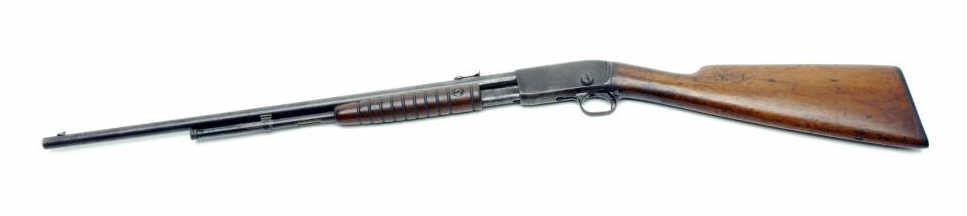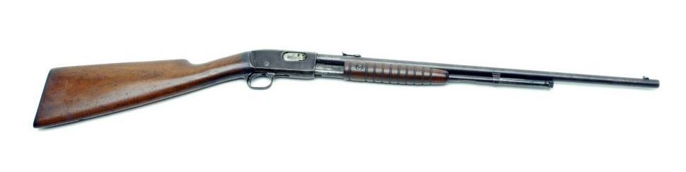Remington Model 12 takedown pump action rifle, .22 Short, Long or Long Rifle cal., serial #665234. The rifle is overall good condition with a 22” round barrel. The barrel and magazine show a mottled brown patina with small amounts of bluevisible in the protected areas and on the magazine tube. The receiver is brown with light surface rust evident. The smooth wood stocks are in overall good condition with mars and compressions consistent with field use. The butt stock endswith a Remington marked plastic butt plate. The bore is very good, the action crisp and markings sharp. Est.: $200-$400. (C+R)