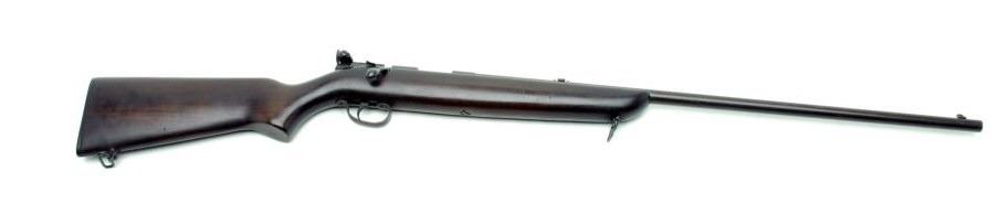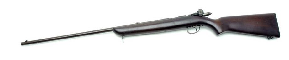 Remington Model 510 “The Targetmaster” bolt action rifle, .22 S,L,LR, 25” barrel, blue finish, pistol grip stock, hard rubber butt plate, NSNV. This rifle remains in good to very good condition showing its blue finish going to a brown patinaalong with wear to the edges. The rear sight has been removed and a Lyman receiver mounted rear sight has been added. The stocks remain in very good condition showing dings and scratches from use. The bore is bright and the action is crisp.(Modern) Est.: $200-$400