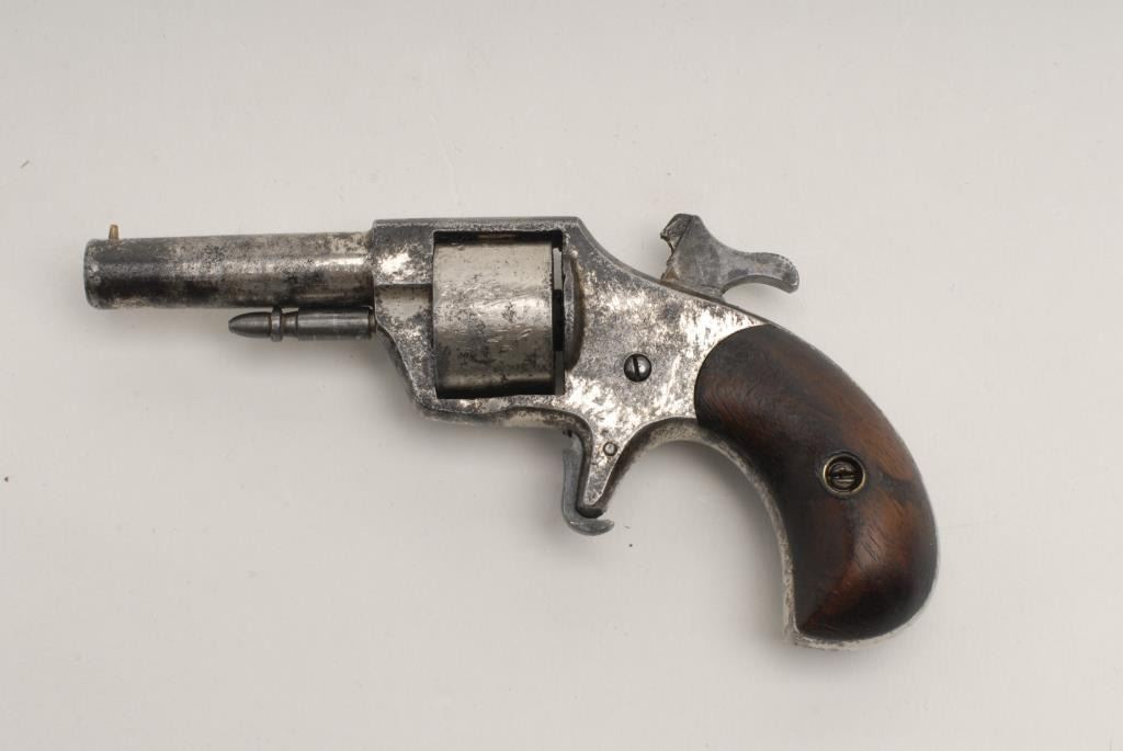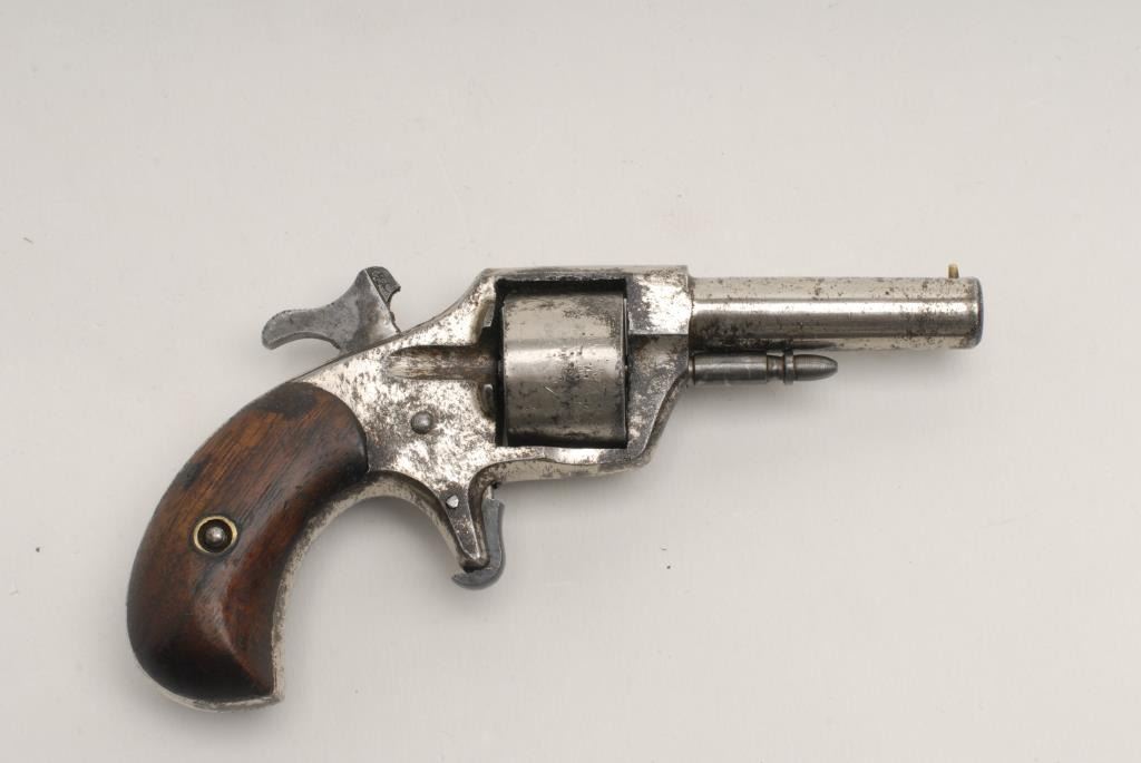 Jewel No. 1 Spur Trigger revolver, .22 Rimfire caliber, 2 ¼” barrel, nickel finish, wood grips, S/N 10970. This revolver remains in fair condition overall showing approximately 40%-50% finish remaining with the balance going to a dark patinaalong with areas of pinprick pitting. The grips remain in good condition and the action does not work. (Antique) Est.: $100-$200