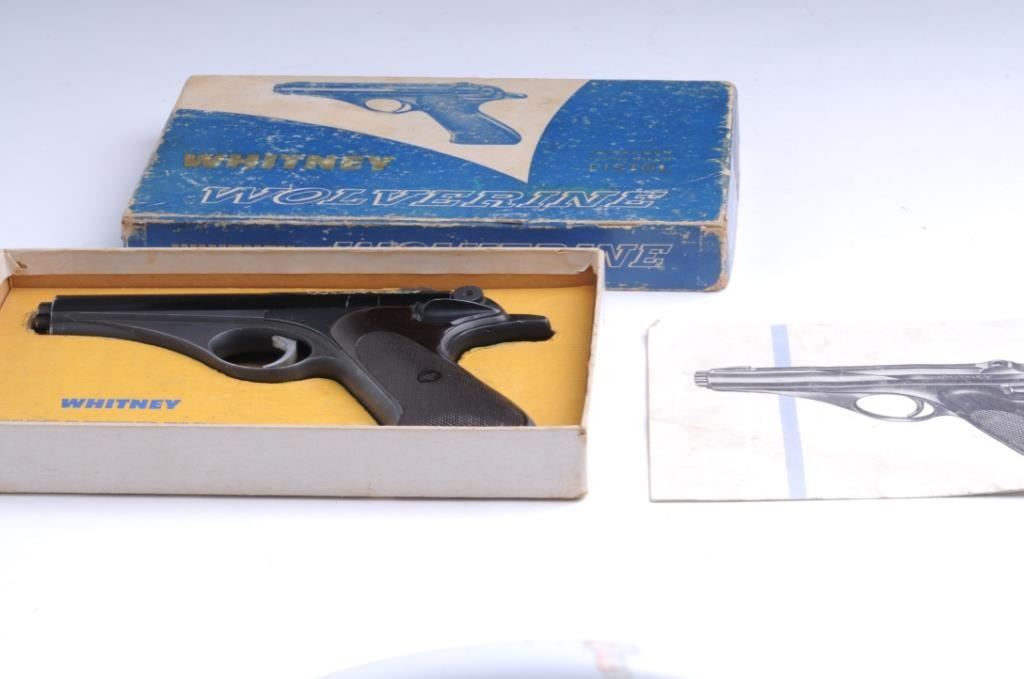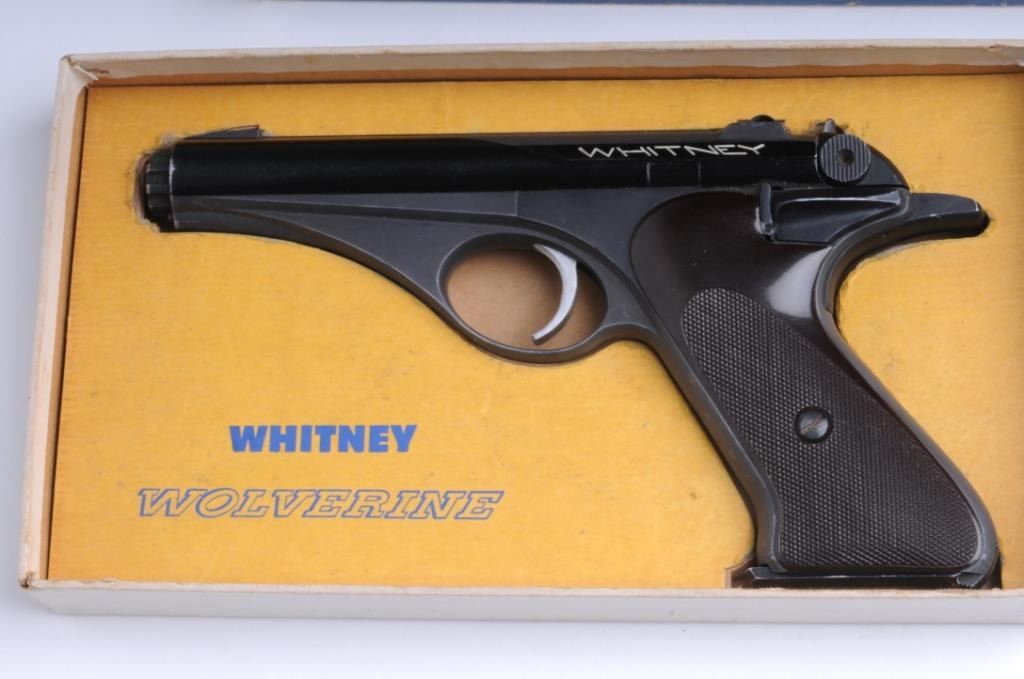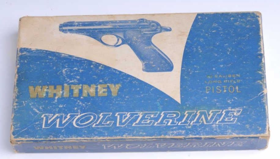 Whitney Wolverine Model semi-automatic pistol, .22LR caliber, S/N 27141, black finish, checkered brown plastic grips in overall fine condition with a crisp action, sharp markings, very good to fine bore and fine grips. Accompanied by a factorycardboard box and instructions. Est.: $300-$600.