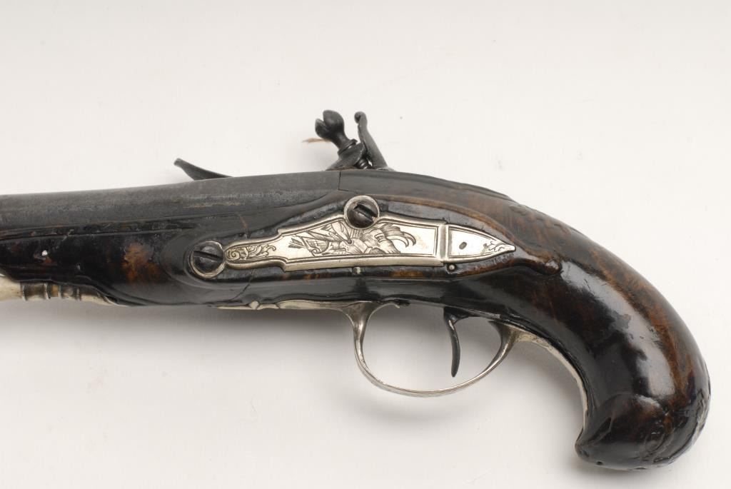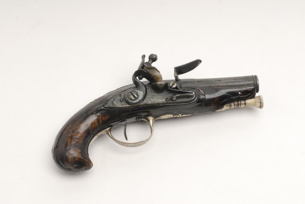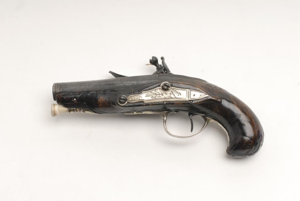 French flintlock pocket pistol, .50 caliber, 7” overall with 3.5” barrel in overall good to very good condition, good action, sterling mounts, very good carved burl wood stock with several old well-done repairs. Accompanied by consignor notes that states bought in New Orleans and was one of a pair; family would sell only one; consignor also notes “Gillier” marked as maker (Antoine Gillier (1681-1757)) of either of the whole gun or the barrel; reportedly well-known maker who worked atthe St. Etienne Arsenal and for the Tissot family (1740-1750). (Antique). Est.: $600-$1,200.