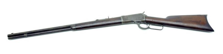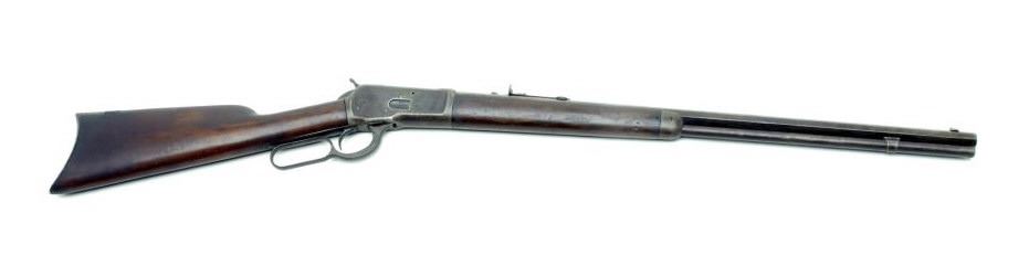 1892 Winchester lever action rifle, 25-20 W.C.F. cal., serial #432873. The rifle is in overall good condition with a 24” octagon barrel with a post front and adjustable rear sights. The barrel and magazine are going to a brown patina withtraces of blue in the protected areas. The edges remain fairly sharp and markings are clear. The receiver is nearly all brown with some muted case color evident on the hammer and lever. The smooth wood stocks are in good condition with moderatesurface mars, scratches, an older coat of varnish added and a wood replacement just in front of the metal, crescent butt plate. The bore is good, the action crisp and markings sharp on this Winchester. Est.: $600-$1,200. (C+R)
