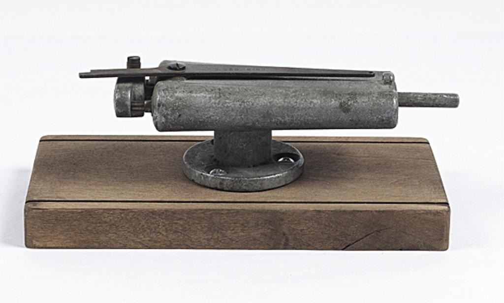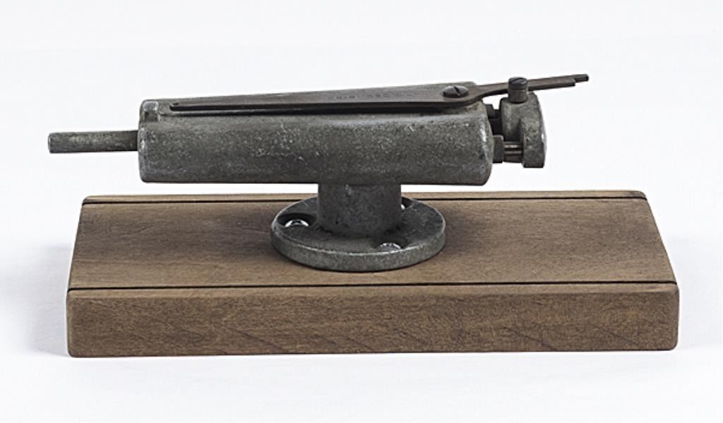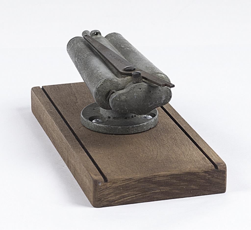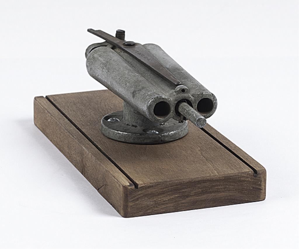 .36 caliber, 4.25" barrels. George Pratt's double-barrel burglar alarm and animal trap gun circa 1880-1890. This example has a patent date of Dec 18, 1883 on the trigger. The gun is complete with the swivel mounted on wooden base. Very goodcondition. Est:$300-500