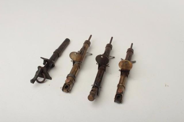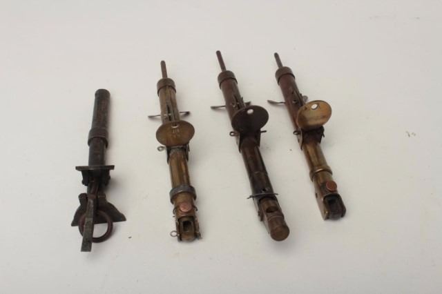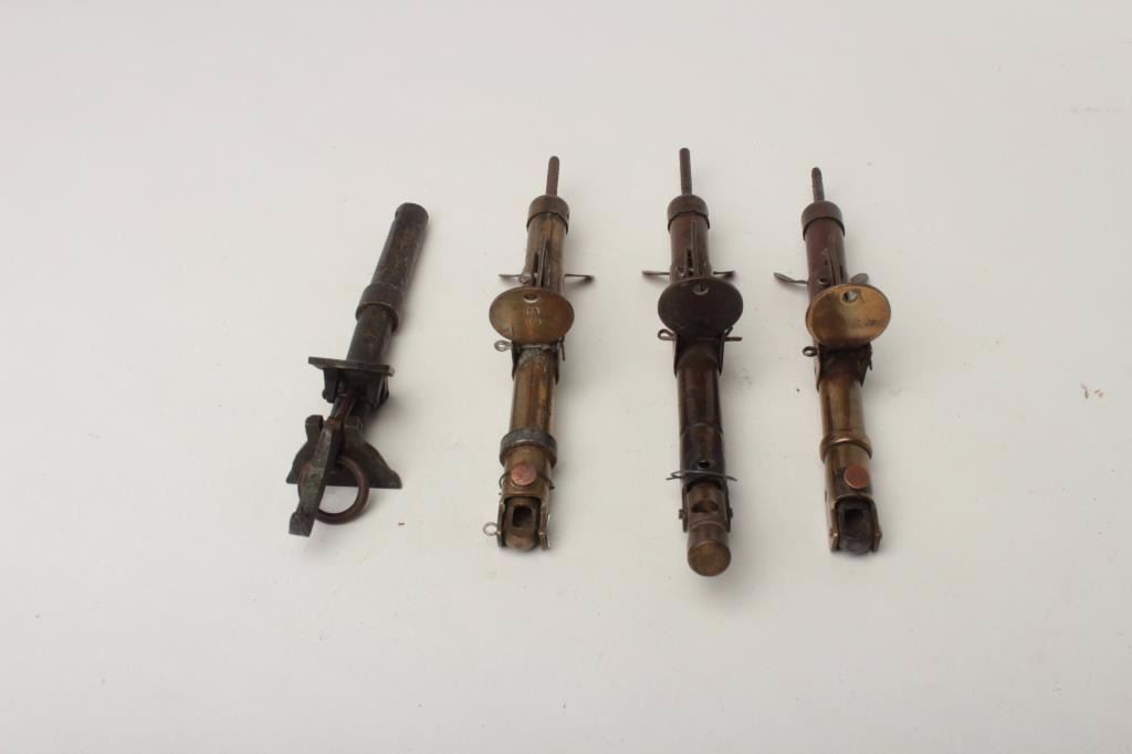 Tubular Brass Alarm Devices, Lot of 4 Ranging from 7.25" to 10" in length, spring loaded with trigger plates. One example has a "1903" patent date. Fair to good. One with dark patina. Est:$200-300