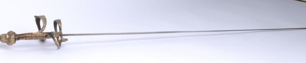17th century style rapier from Victorian era with cast ornate brass grip and etched blade. In good condition with patina and aging. A genuine antique made to adorn castles and great halls of Europe by craftsman one hundred years ago as originalswere scarce even at that time! Est.: $300-$600