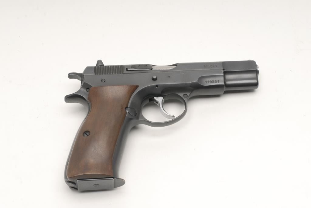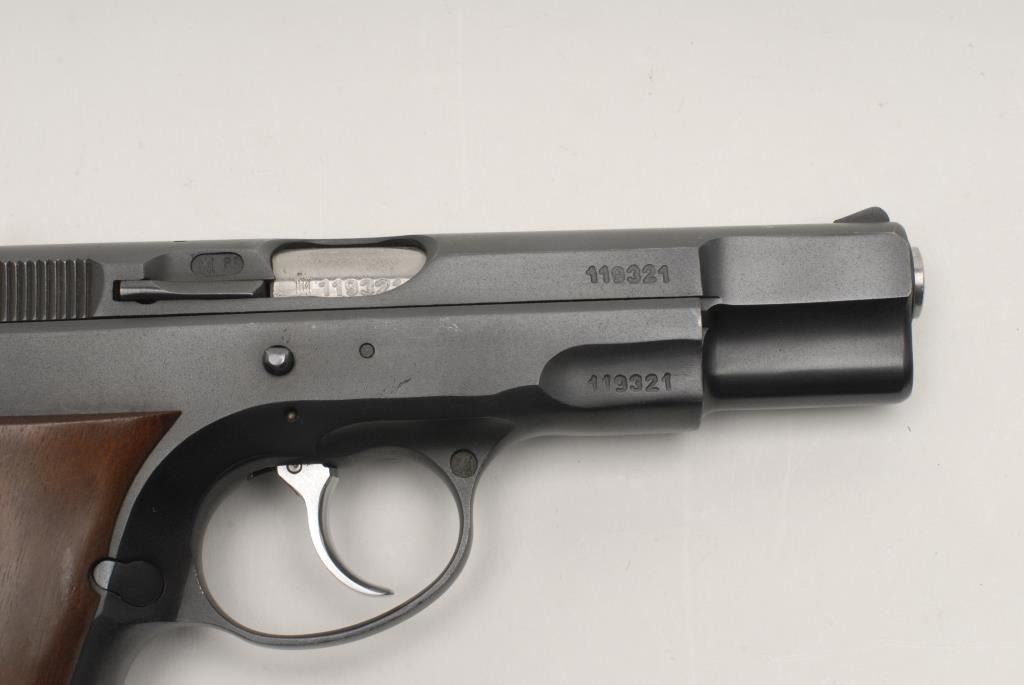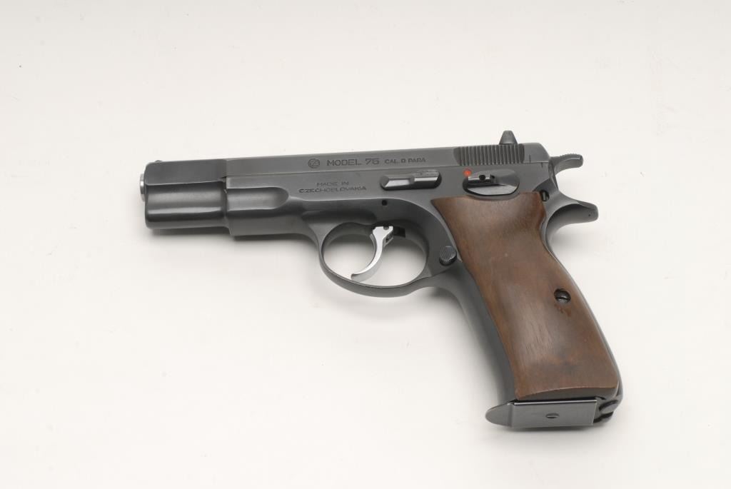 CZ Model 75 DA semi-automatic pistol, 9mm caliber, 4.5” barrel, S/N 119321, in overall fine condition showing the majority of its original mat black finish, fine bore, action, markings and wood grips. (Modern/PPT). Est.: $250-$500.