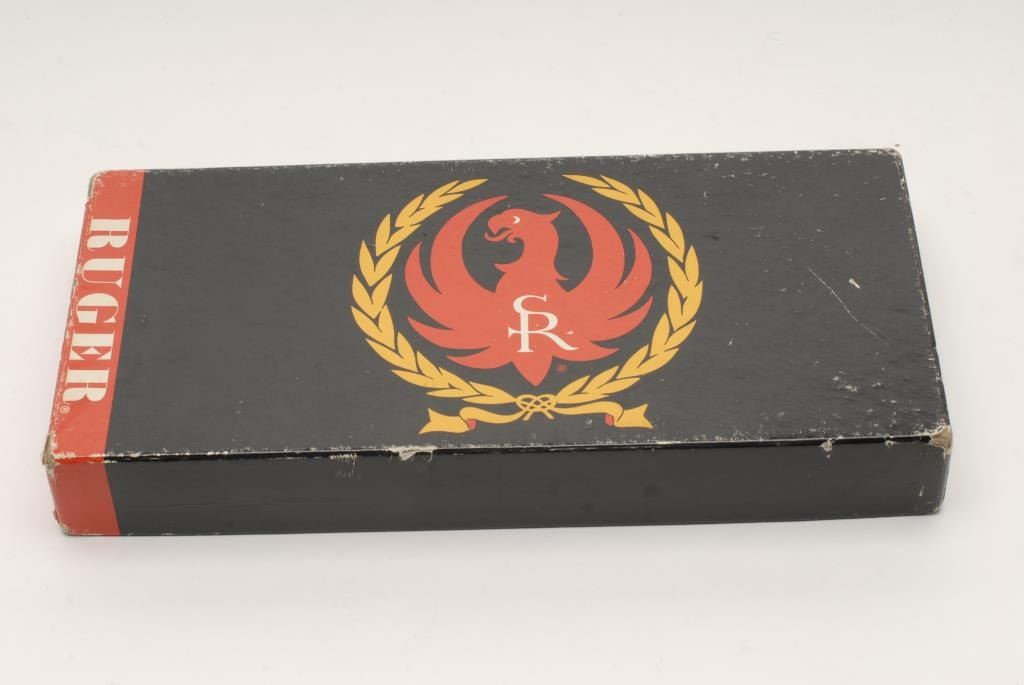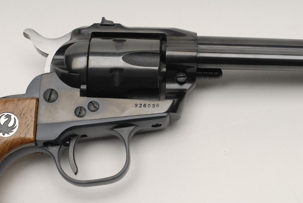 Ruger Single Six Model Single Action revolver, .22 Win. RF caliber, 6.5” barrel, blued finish, smooth wood medallion grips in overall fine condition displaying the majority of its original blue finish, crisp action, sharp markings and fine bore and grips. Accompanied by original two piece factory cardboard box with instructions and hang tag. (Modern/PPT). Est.: $250-$500.