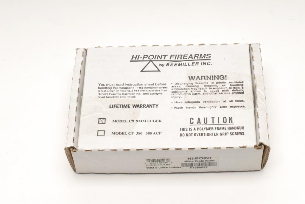 Hi-Point Firearms Model C-9 semi-automatic pistol, 9mm Luger caliber, 3.5” barrel, S/N P 1585827, mat black finish to polymer frame, black plastic grips, in like new condition in factory cardboard box with extra ghost ring front sight andinstallation instructions. (Modern/PPT). Est.: $150-$300.