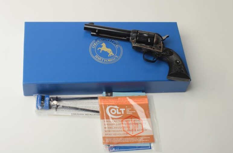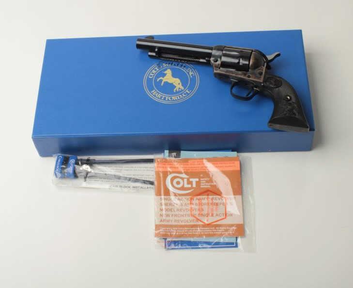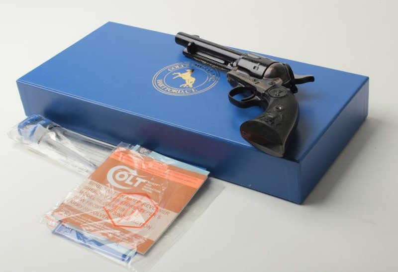 Colt S.A.A. Revolver in .45 Colt caliber, 5 ½” barrel, blue and case hardened with eagle grips, S/N S37024A. Like new in box from dealer’s inventory and never sold. Currently back ordered and not available. 99% New. In original box.(Exempt/No PPT) Est.: $1000-$2000