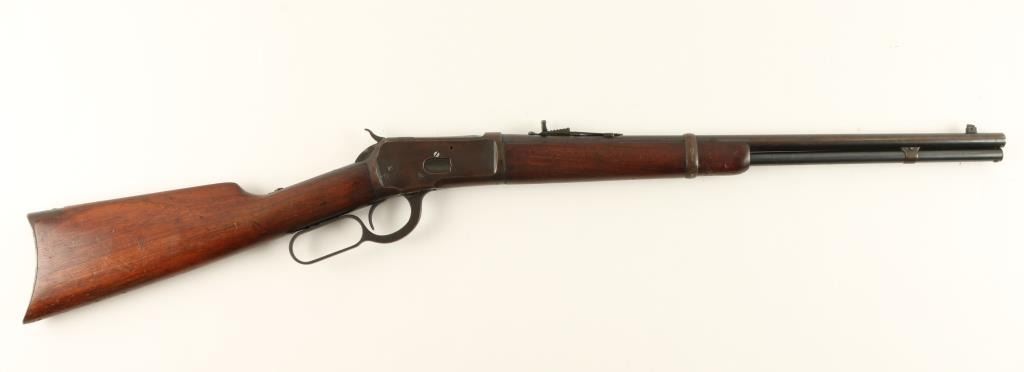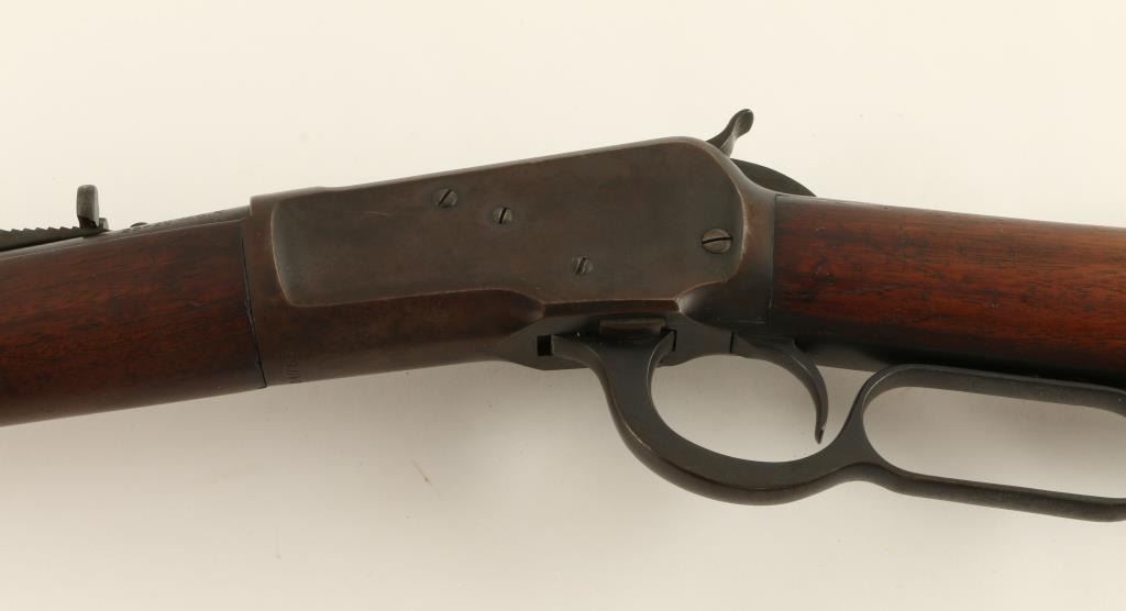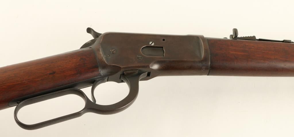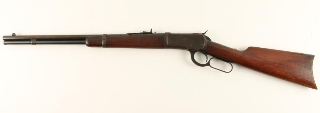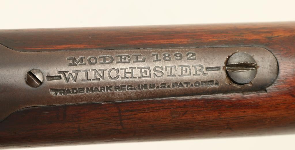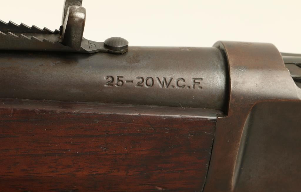 Winchester Model 1892 lever action carbine, .25-20 W.C.F. caliber, 20” barrel, S/N 804765, blued finish, wood stocks in overall very good un-cleaned condition displaying a dark patina with mixed areas of original blue, good bore, crispaction, very good markings and wood with scattered old scratches and some mars from legitimate carry, use and storage. (C&R). Est.: $1,200-$2,400.