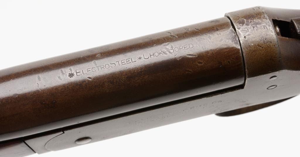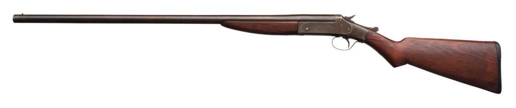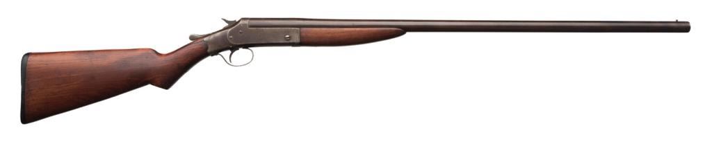 Palmetto Arms Co. top break single shot shotgun, 16 gauge, 29-3/4” barrel, brown patina, wood stocks, #NVSN. This gun is in overall good condition showing a brown patina on metal surfaces, fair bore, good action, wood stocks arefair to good as refinished with repair at the front of the butt stock by the upper tang and a slight crack behind the upper tang a the wrist. Est.: $125-$175.