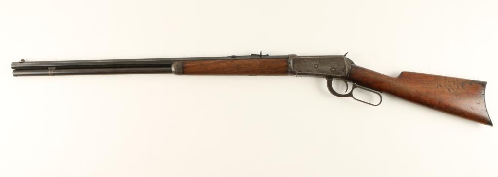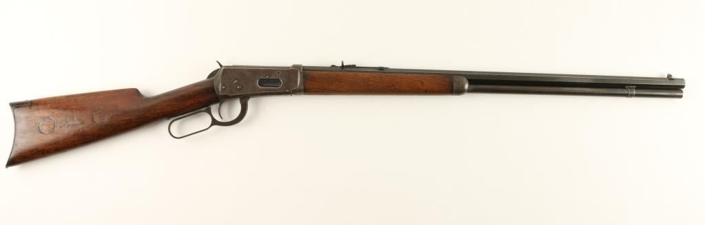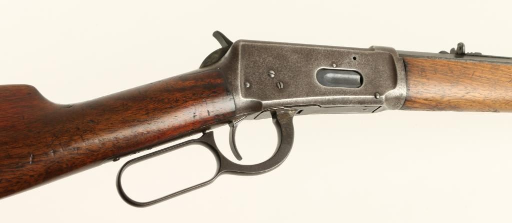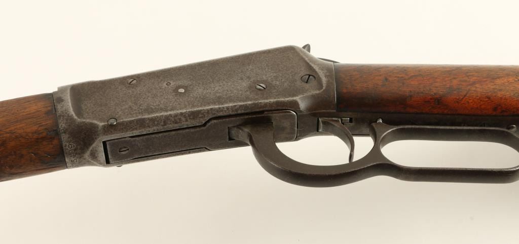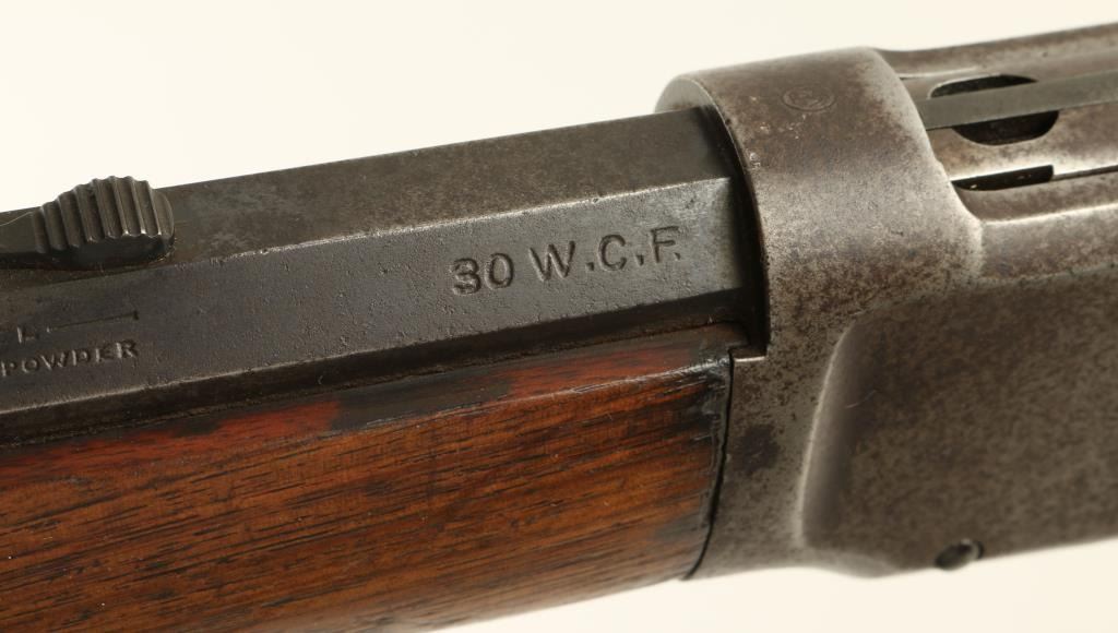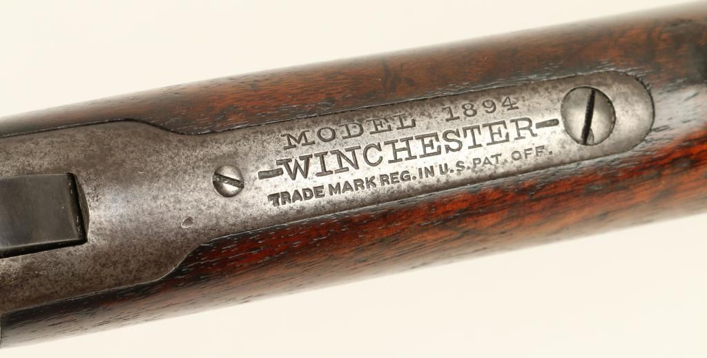 Winchester Model 1894 lever action rifle, .30 W.C.F. caliber, 26” octagon barrel, S/N 576409, blued finish, wood stocks in overall good to very good condition showing a dark patina to metal surfaces with areas of muted original blue, crispaction, good markings and a very good bore; the wood butt stock shows scattered old mars and scratches from carry and storage plus two carved old circles and one carved oval design on the right side. (C&R). Est.: $700-$1,400.
