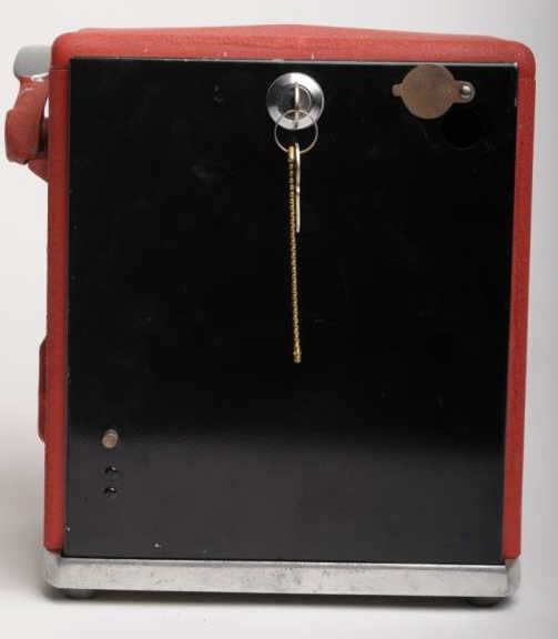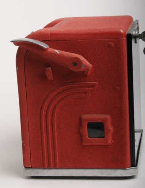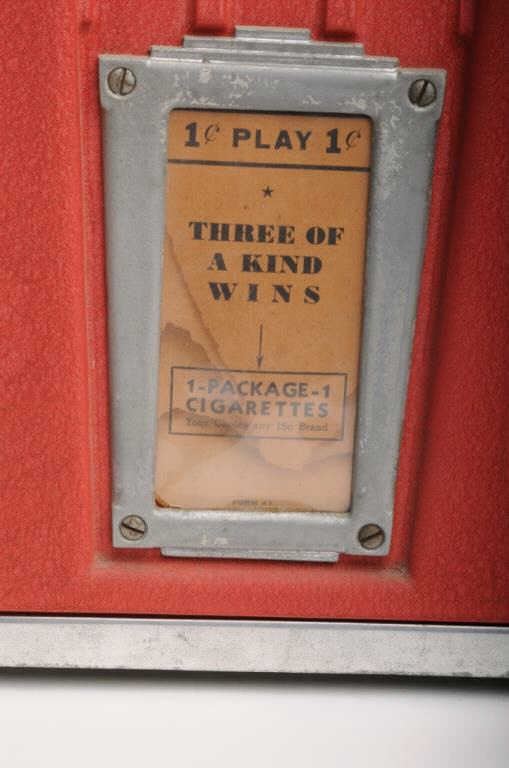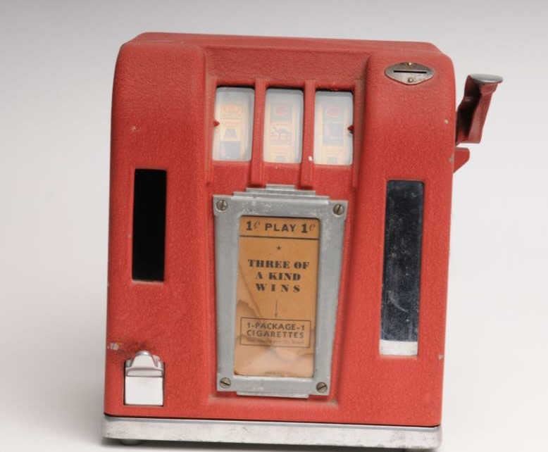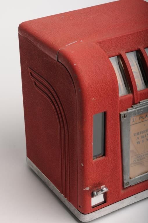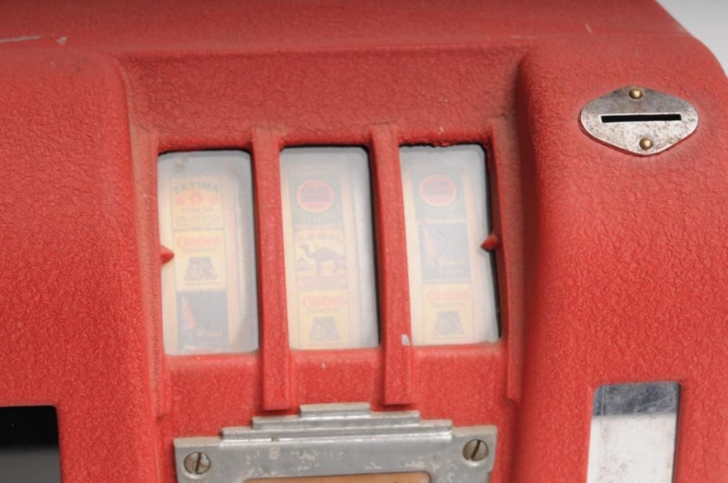 Counter top one cent Trade Stimulator, ca. 1920-1930, approximately 11” tall, 9” wide and 8” deep; red finish, three spinners show different cigarette brands (takes matching all 3 to win); with key to back panel and in overall goodcondition and working at time of description! Est.: $350-$700.